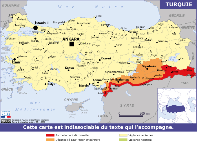 Turquie Navigation latérale fiche pays Dans cette rubrique Turquie Présentation de la Turquie Conseils aux voyageurs Dernières minutes et alertes Sécurité Entrée / séjour Santé Informations utiles Voyages d'affaires Contacts utiles Politique et économie Relations bilatérales Sécurité Date de mise à jour le : 07 avril 2026 Information toujours valable à la date du jour Imprimer Imprimer Vous voyagez à l'étranger ? Pour recevoir des alertes, inscrivez-vous sur Fil d'Ariane. S'inscrire sur Fil d'Ariane Donnez-nous votre avis Aidez-nous à améliorer notre service en répondant à notre enquête. Répondre à l'enquête utilisateurs Fermer Vérifiez que vous êtes bien assurés Avant de voyager, il est indispensable de vérifier que vous êtes bien assuré Quelle est la portée des Conseils aux Voyageurs ? Zones de vigilance Dernière actualisation le 23/03/2026, information toujours valable à la date du jour Zones formellement déconseillées (rouge sur la carte) Compte tenu du contexte régional, les abords immédiats des frontières avec la Syrie et l’Irak sont formellement déconseillés. Des restrictions à la circulation sont possibles dans les districts frontaliers avec la Syrie et l’Irak (Reyhanli, Kirikhan, Siirt, Şırnak et Hakkari). Zones déconseillées sauf raison impérative (orange sur la carte) Les départements du Hatay, de Kilis, de Gaziantep, de Şanlıurfa, de Mardin, de Diyarbakır, de Batman sont déconseillés sauf raison impérative. Les préfectures de ces départements mettent régulièrement en place des contrôles renforcés sur les personnes et les véhicules et sont susceptibles sous faible préavis de décider de restrictions d’accès à certaines zones. Il convient de se renseigner attentivement sur la situation locale avant tout déplacement. En cas de déplacement dans ces zones pour raison impérative, l’ensemble des conseils des zones de vigilance renforcée s’appliquent avec une attention accentuée. Une escorte sécuritaire, organisée avec les autorités locales, est alors recommandée. Zones de vigilance renforcée (jaune sur la carte) Dans les zones figurant en jaune sur la carte, il est recommandé de faire preuve d’une vigilance renforcée, de rester discret (éviter de parler fort dans une langue étrangère dans la rue, éviter de poster sa géolocalisation sur les réseaux sociaux), de ne pas se déplacer seul, notamment le soir, de toujours avoir sur soi ses documents d’identité français. Il est également conseillé d’éviter tout rassemblement de foule et de se conformer strictement aux consignes qui pourraient être données sur place par les autorités turques, en particulier dans les zones touristiques et les quartiers très fréquentés. La frontière avec l’Arménie est fermée et les deux postes frontières d’Aryaka (province de Kars) et d’Alican (commune d’Egdir) ne fonctionnent plus depuis 1993. Risques et recommandations associées Risques naturels Séismes La majeure partie du territoire turc se trouve dans une zone de forte activité sismique. Les tremblements de terre y sont fréquents. Les tremblements de terre qui ont eu lieu le 6 février 2023 dans le Sud-Est de la Turquie ont causé des pertes humaines considérables et des dégâts matériels importants. En cas de séjour dans le pays, consulter les recommandations d’usage. En cas de séisme, il convient de garder son calme, de suivre les instructions données et d’attendre les secours, si nécessaire. Il est rappelé que tout séisme important peut être suivi de plusieurs secousses secondaires. Pour plus d’informations quant aux mesures à prendre, consulter : le site turc de la gestion des catastrophes naturelles et des urgences (site en turc et en anglais) les sites et les réseaux sociaux de l’ambassade de France à Ankara (X, Instagram et Facebook) et du consulat général de France à Istanbul (X, Instagram et Facebook) sur la conduite à tenir en cas de séisme. Feux de forêt et inondations Du fait du climat méditerranéen, les risques d’inondations (dans le Nord-Est du pays notamment) et de feux de forêt, notamment sur les côtes égéennes et méditerranéennes sont également significatifs. Terrorisme Le risque terroriste reste élevé sur l’ensemble du territoire, en raison notamment de la proximité immédiate avec des zones de conflit où sont présents des groupes terroristes (Syrie, Irak). Les intérêts et les ressortissants français en Turquie peuvent être également pris pour cible. Les Français résidents ou de passage sont invités à faire preuve d’une vigilance renforcée lors de leurs déplacements, en particulier dans les lieux accueillant des événements publics et/ou des regroupements importants, les lieux de forte affluence, les quartiers touristiques ou les lieux de culte. La Turquie a en effet connu une importante vague d’attentats entre 2015 et 2017. Dernièrement, plusieurs attentats sont survenus : le 23 octobre 2024 contre le siège de Turkish aerospace Industries à Ankara, le 6 février 2024 devant le principal tribunal d’Istanbul, le 28 janvier 2024 dans l’église de Santa Maria du quartier de Büyükdere à Sariyer, le 1er octobre 2023 devant le ministère turc de l’Intérieur à Ankara, et le 13 novembre 2022 sur l’avenue Istiklal à Istanbul. Manifestations Il est formellement recommandé de se tenir à l’écart d’éventuels rassemblements et manifestations, en particulier de nature politique. Ceux-ci peuvent en effet être la cible d’attaques, ou d’affrontements entre manifestants et forces de l’ordre. Vigilance à apporter lors des déplacements routiers Des vols ont été constatés l’été, à l’égard de véhicules stationnés sur des aires de repos. Il est recommandé de conserver sur soi tous les titres d’identité et de voyage et documents officiels (permis de conduire, livret de famille, etc.) et de ne laisser aucun objet de valeur dans le