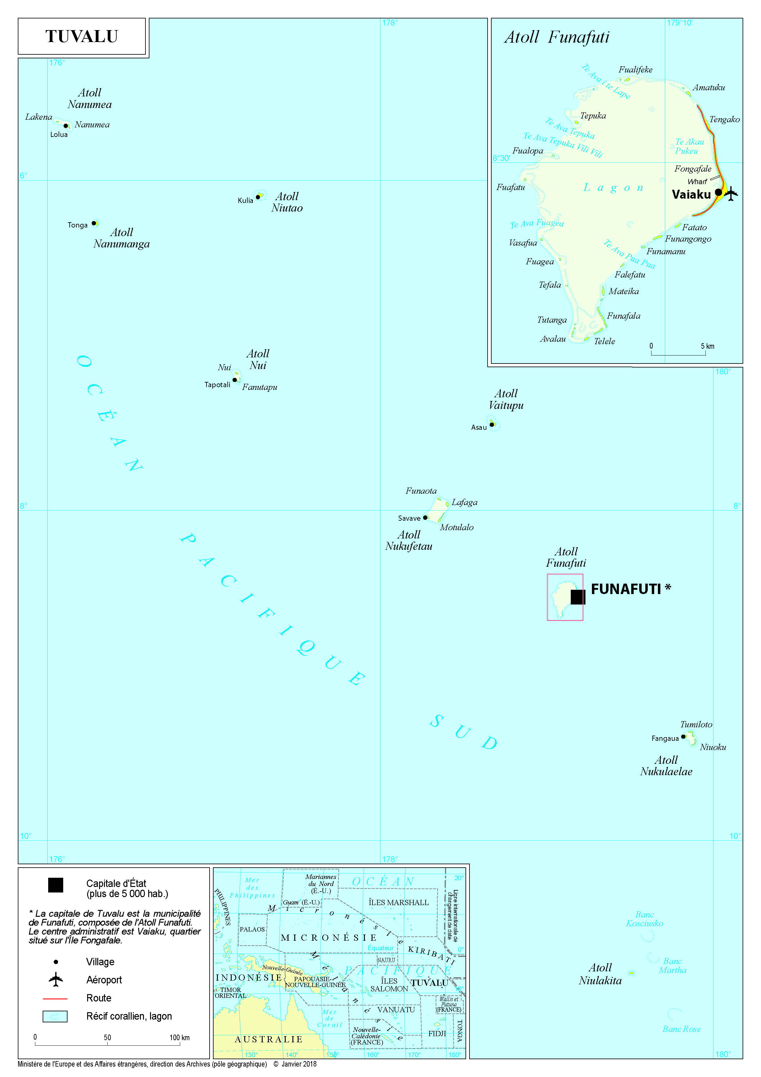 Tuvalu Navigation latérale fiche pays Dans cette rubrique Tuvalu Présentation des Tuvalu Politique et économie Relations bilatérales Présentation des Tuvalu Date de mise à jour le : 03 avril 2026 Information toujours valable à la date du jour Présentation du pays Données générales Nom officiel : Etat des TuvaluNature du régime : Monarchie constitutionnelleChef de l’Etat : Charles III, représenté par le Gouverneur-Général Tofiga Vaevalu FALANIChef du gouvernement : M. Feleti TEO (depuis février 2024), Premier ministre Données géographiques Superficie : 26 km² ZEE : 749 790 km2Capitale : FunafutiLangues officielles : tuvaluan, anglais Données démographiques Population : 9 816 habitants (Banque mondiale 2023).Densité : 393 hab/ km².Croissance démographique : -1,8 % (Banque mondiale 2023).Espérance de vie : 67 ans (Banque mondiale 2023).Religions : 97% Eglise des Tuvalu (Eglise chrétienne protestante spécifique au pays, qui mélange le christianisme, apporté par des missionnaires samoans de la London Missionary Society et des éléments ancestraux des croyances autochtones) Indice de développement humain (2025) : 0,689 (129ème sur 191) Politique intérieure Suite aux élections parlementaires de janvier 2024 qui ont élu 16 députés, ces derniers se sont retrouvés pour élire un Premier ministre. Le 26 février 2024, Feleti TEO a été nommé Premier ministre et a annoncé la composition de son gouvernement le 28 février. Les Tuvalu font partie des trois pays les moins avancés (PMA) d’Océanie et sont très vulnérables aux effets du changement climatique. On estime qu’il pourrait s’agir du premier Etat souverain à devenir inhabitable d’ici 50 ans en raison des effets du changement climatique. Dans ce contexte, le gouvernement met l’accent sur le besoin d’adaptation aux conséquences du changement climatique pour maintenir sa population aux Tuvalu, refusant à l’heure actuelle la perspective d’en faire des réfugiés climatiques condamnés à l’exode. D’ici 2025, il a notamment pour objectif d’assurer 100% de l’approvisionnement énergétique grâce à l’énergie solaire et à l’éolien. Pour laisser une trace de son patrimoine et de ses îles avant qu’elles ne soient englouties, l’archipel a annoncé bâtir un clone numérique de ses terres, de ses lagons et de ses traditions en août 2023. A compter du 1er octobre 2023, le gouvernement a également modifié la Constitution du pays afin de rester un Etat, quand bien même son territoire finirait par être englouti. L’aide internationale constitue une ressource déterminante pour ce pays. Outre le fonds souverain « Tuvalu Trust Fund » mis en place par le Royaume-Uni, l’Australie et la Nouvelle-Zélande, les principales sources de revenus des Tuvalu demeurent les droits perçus sur les licences de pêche, les revenus du nom de domaine internet (l’extension « .tv » est vendue aux chaînes de télévision du monde entier) et les droits de douanes. Le pays, d’abord intéressé par la possibilité d’une exploitation minière de ses aires maritimes, est revenu sur sa décision en avril 2022. Politique étrangère Membres du Groupe des leaders polynésiens (GLP), les Tuvalu entretiennent de bonnes relations avec leurs voisins du Pacifique, notamment l’Australie et la Nouvelle-Zélande, mais également avec les Fidji, partenaire économique primordial et nœud de communication important pour Funafuti. En novembre 2023, Tuvalu et l’Australie ont passé un accord historique le « Falepili Union » fondé sur la reconnaissance permanente et la défense par l’Australie des frontières et de la souveraineté même une fois l’Etat submergé, un dispositif de mobilité permettant à 280 citoyens de Tuvalu d’obtenir chaque année un titre de séjour permanent en Australie à partir de 2025 ainsi qu’un volet sécurité. Le gouvernement de Feleti TEO a réaffirmé son soutien à ce partenariat. Les principaux bailleurs de fonds sont la Nouvelle-Zélande (8,9 M EUR pour 2019 - 2020), l’Australie (8,2 M EUR en 2021-2022), le Japon et l’Union européenne (programme indicatif national de 6,8 MEUR pour la période 2014-2020). Funafuti entretient également des relations diplomatiques avec Taipei qui dispose d’une représentation sur place. Les deux pays ont signé un accord de pêche fin mai 2016. Le Premier ministre NATANO a rappelé son attachement à Taïwan lors de son élection, puis en 2022 lors d’une visite à Taipei, et son successeur en a fait de même dès la formation de son gouvernement le 28 février 2024 par le biais d’un communiqué conjoint. Les États-Unis ont également signé un accord de pêche au thon avec les Tuvalu via l’Agence de pêche du Forum des îles du Pacifique (FFA). Ils fournissent des aéronefs de la Garde côtière américaine et de la Marine américaine qui aident le pays à protéger sa zone économique exclusive (ZEE). Dans le cadre du renforcement de la présence des Etats-Unis dans le Pacifique, Tuvalu a signé avec les Etats-Unis un accord « historique » de soutien à l’investissement (Tuvalu-US Investment Incentive Agreement) le 4 novembre 2020 ;La US International Development Finance Corporation (DFC), la banque américaine de développement, s’engage à mettre à disposition tous ses outils d’investissement, y compris le financement par emprunt et par fonds propres. Les Tuvalu sont très actifs dans les négociations sur le climat et l’environnement ainsi qu’ils l’ont montré notamment lors de la COP21. Situation économique Tuvalu est un micro-état (membre de l’Organisation des Nations unies - ONU - le moins peuplé) classé parmi les pays les moins avancés malgré son PIB par habitant de 5335 USD, soit un PIB de 60 M USD en 2022. Le pays a connu une croissance de 0,7% en 2022, après une baisse de 4,3% de son PIB en 2020, et sa croissance est instable, connaissant fréquemment de grandes variati