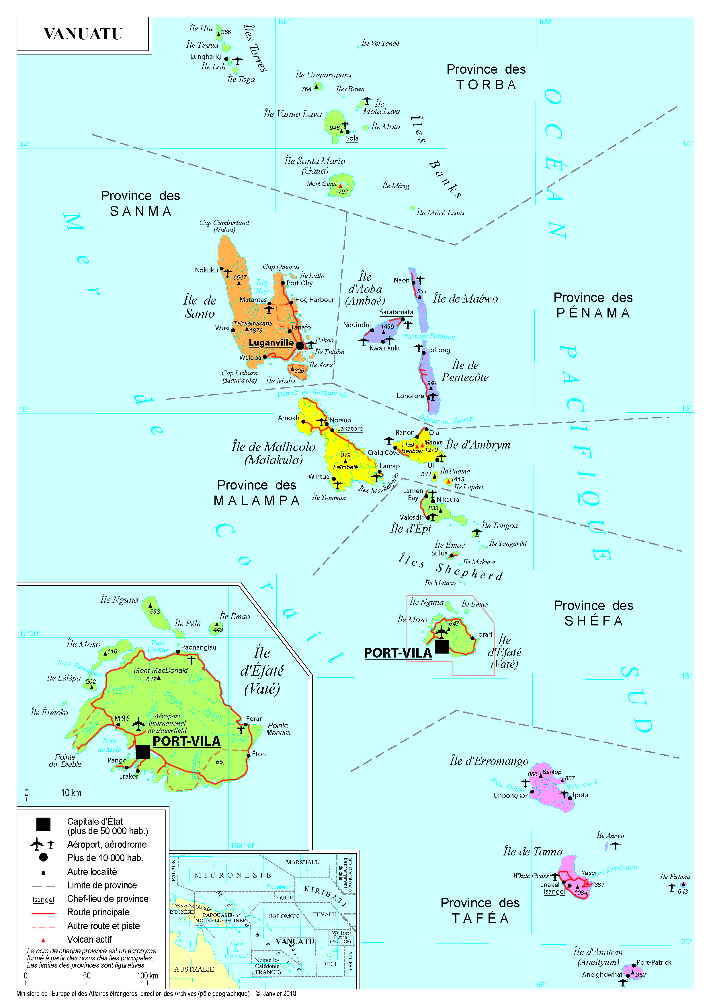 Vanuatu Navigation latérale fiche pays Dans cette rubrique Vanuatu Présentation du Vanuatu Conseils aux voyageurs Dernières minutes et alertes Sécurité Entrée / séjour Santé Informations utiles Voyages d'affaires Contacts utiles Politique et économie Relations bilatérales Présentation du Vanuatu Date de mise à jour le : 03 avril 2026 Information toujours valable à la date du jour Présentation du pays Données générales Nom officiel : République du VanuatuNature du régime : République parlementaireChef de l’Etat : M. Nikenike VUROBARAVU (juillet 2022)Chef du gouvernement : Jotham NAPAT (février 2025) Données géographiques Superficie : 12 189 km²ZEE : 680 000 km2Capitale : Port-VilaVilles principales : Port-Vila, LuganvilleLangues officielles : bichelamar, anglais, françaisMonnaie : Vatu Données démographiques Population : 327 777 habitants (Banque mondiale 2024)Densité : 24 hab/ km²Croissance démographique : 2.3 % (Banque mondiale 2024)Espérance de vie : 71 ans (Banque mondiale 2023)Taux d’alphabétisation : 89 % (Banque mondiale 2021)Religions : 83% de la population est chrétienne, dont 32% presbytérienne, 13% catholique, 13% anglicane, et 11% adventistes du septième jourIDH : 0,621 (146ème sur 191 en 2025) Politique intérieure Structurellement fragile, marqué par son relatif isolement géographique, son caractère archipélagique (plus de 80 îles), la République du Vanuatu était l’un des quatre pays les moins avancés (PMA) en Océanie jusqu’en 2020. Le pays présente une forte vulnérabilité aux risques naturels : les dégâts liés au cyclone Pam de 2015 ont représenté deux tiers du PIB, le cyclone Harold a détruit 80% des habitations dans la province de Sanma en avril 2020… Le pays a encore été frappé par trois cyclones en 2023 puis par un tremblement de terre d’une magnitude de 7.3 en décembre 2024. Les dégâts engendrés sont évalués à 17,6% du PIB. Le Vanuatu a longtemps souffert d’une instabilité gouvernementale jusqu’à l’élection du francophone Charlot SALWAI au poste de Premier ministre. Celui-ci a conservé ses fonctions de 2016 à 2020, offrant au pays une certaine stabilité politique. Après trois changements de gouvernements, Charlot SALWAI reprend ce poste de 2023 à février 2025, date à laquelle Jotham NAPAT est élu Premier ministre, après des élections retardées par le tremblement de terre Politique étrangère Le Vanuatu a fait du soutien à la décolonisation l’un des axes principaux de sa diplomatie. Membre actif et Etat du siège du Groupe du Fer de Lance mélanésien (GFLM) créé en 1988, il appuie systématiquement les mouvements indépendantistes mélanésiens. Sur le plan environnemental, le Vanuatu est très actif sur les questions de lutte contre le changement climatique dans les enceintes multilatérales. Il défend notamment la création d’un système de régulation international des émissions de gaz à effet de serre et l’adoption d’un traité sur la pollution plastique. Le Vanuatu a fait adopter, à l’Assemblée générale des Nations unies, en mars 2023, une résolution demandant à la Cour Internationale de Justice de donner un avis sur la question de la responsabilité juridique des Etats pour les dommages causés à l’environnement. Cette initiative a été soutenue par 130 pays, dont la France. Situation économique Le Vanuatu demeure très dépendant des bailleurs internationaux, l’aide au développement contribuant largement à la croissance du pays (11% de son revenu national brut). L’Australie s’impose à ce titre comme le premier fournisseur d’aide publique au développement (37% de l’aide reçue), estimant fournir 83,2M AUD pour la période 2024-2025 (46,4 M EUR). La Nouvelle-Zélande apporte également un fort soutien économique et financier au Vanuatu. En parallèle des accords bilatéraux de libre-échange, le Programme d’aide néo-zélandais a investi 32 M NZD (16,4 M EUR) pour le développement du pays en 2024-2025. La République populaire de Chine est l’un des principaux bailleurs du pays. Elle détient à ce titre plus de 50 % des 471 M USD (403,3 M EUR) de dettes extérieures du pays au titre de l’année 2023. L’Union européenne (31 M EUR au titre du 11ème FED – 2014-2020), et le Japon développent également d’importants programmes d’assistance dans le pays. Près de 80% de la main-d’œuvre est employée dans l’agriculture, à l’origine de près de 80% des exportations (huile de coco, coprah, viande de bœuf, kava). Les principaux partenaires d’exportation en 2023 sont l’Australie, les Fidji, la Chine, puis la Nouvelle-Calédonie en quatrième position. Si le secteur de l’agriculture s’est rétabli après les cyclones de 2023, ce n’est pas le cas du tourisme, fragilisé par le manque de connections aériennes internationales et la disparition d’Air Vanuatu en mai 2024. Liste des représentations françaises Ambassade de France au Vanuatu Lini Highway BP 60 Port-Vila Vanuatu Tel : +678 28 700 Ambassade de France au Vanuatu Réseaux sociaux Facebook