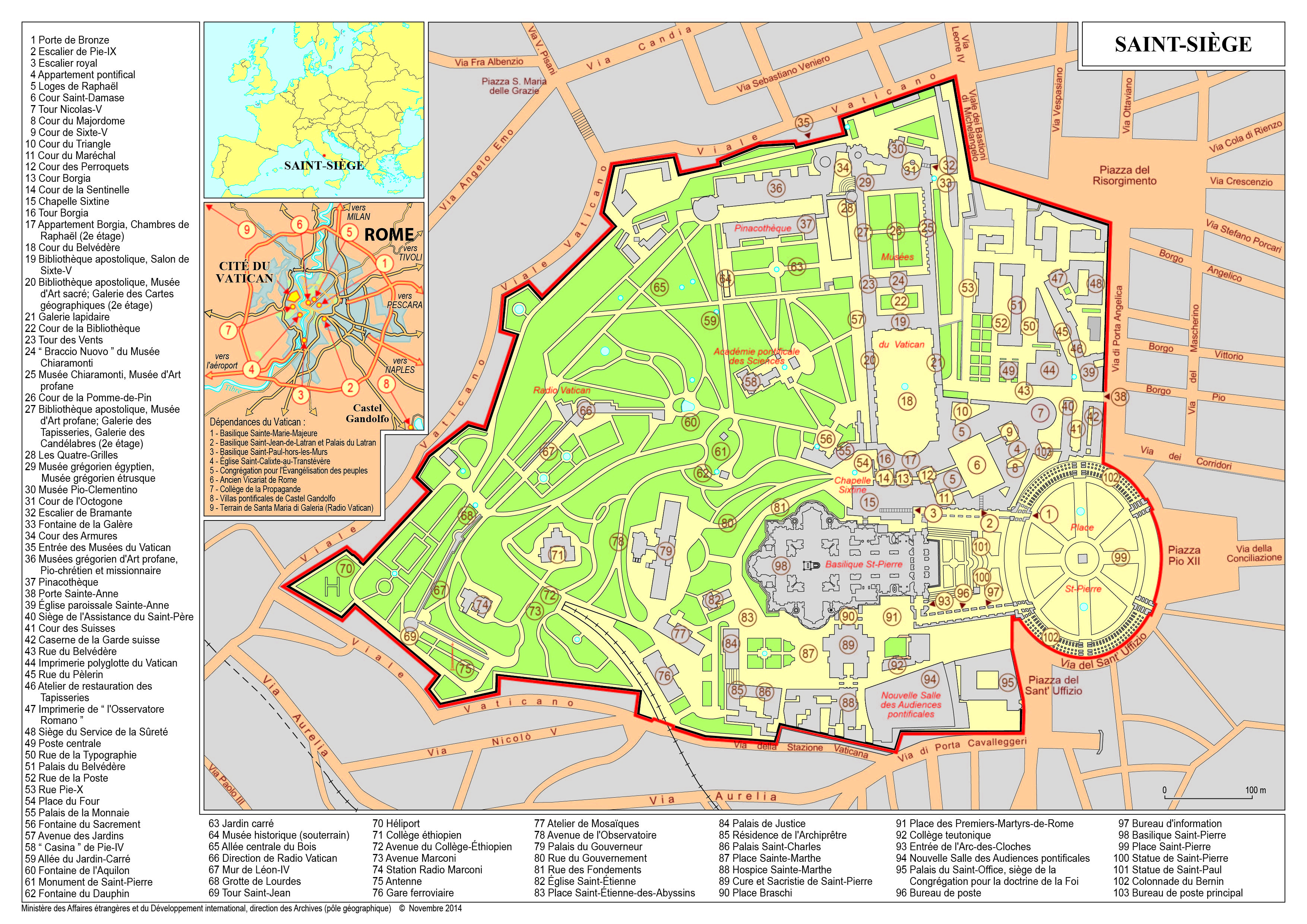 Vatican (Saint-Siège) Navigation latérale fiche pays Dans cette rubrique Vatican (Saint-Siège) Présentation du Vatican Conseils aux voyageurs Dernières minutes et alertes Santé Politique et économie Relations bilatérales Présentation du Vatican Date de mise à jour le : 03 avril 2026 Information toujours valable à la date du jour Présentation du pays Données générales Nom officiel : Saint-SiègeNature du régime : la Papauté est une monarchie absolue élective et de droit divinChef de l’État : pape Léon XIV Données géographiques Superficie : 0,44 km² (le plus petit État souverain au monde)Capitale : Cité du VaticanLangues officielles : italien, latin (langue officielle de l’Église catholique et langue juridique du Vatican), français (langue diplomatique) et allemand (langue de l’armée du Vatican, la garde suisse)Monnaie : euro Politique intérieure Le pape François (Jorge Mario Bergoglio) est décédé, à l’âge de 88 ans, le 21 avril 2025, lendemain de la fête de Pâques, au terme d’un pontificat de douze ans. Son ministère a été axé sur la figure du pauvre, du vulnérable et de l’exclu. Il a également été moteur sur des grands dossiers religieux et politiques, notamment sur écologie et l’accueil des migrants, et poursuivi des chantiers ouverts par ses prédécesseurs, par exemple sur le dialogue interreligieux et la lutte contre les abus sexuels. Le 8 mai 2025, le cardinal Robert Francis Prevost a été élu pape par le conclave, devenant ainsi le premier souverain pontife américain et péruvien. Issu de l’ordre de Saint-Augustin, le Pape a choisi le nom Léon XIV, en référence, entre autres, à l’œuvre du pape Léon XIII. Depuis son élection, Léon XIV a exprimé son engagement sur plusieurs sujets : la synodalité et la gouvernance collégiale, le dialogue interreligieux, la justice sociale et la proximité avec les souffrants ainsi que la fidélité à l’Evangile et aux enseignements du concile Vatican II. Politique étrangère La diplomatie pontificale est l’une des plus anciennes du monde. Le Saint-Siège entretient des relations diplomatiques avec 183 États, ainsi qu’avec l’Union européenne ; il est membre observateur de divers organes dont l’ONU, l’UNESCO, l’OMC et le Conseil de l’Europe et Etat membre de 11 organisations internationales, telles que l’OSCE, l’agence internationale pour l’énergie atomique et l’organisation mondiale du tourisme. Au-delà de son appareil proprement diplomatique, le Saint-Siège dispose d’un réseau de relais d’information et d’action à travers les évêques (4500 dans le monde), les églises et communautés locales, les congrégations religieuses, les ONG catholiques (Caritas notamment) et la communauté de Sant’Egidio, y compris dans les pays en crise et dans les zones rurales. Le Saint-Siège promeut des positions en faveur de la paix, du dialogue international, interculturel et interreligieux, tout en préservant sa neutralité sur des questions plus politiques ou dans les conflits entre États. Le Saint-Siège a toutefois voté pour la première fois le 7 juillet 2017 en faveur du Traité d’interdiction des armes nucléaires.