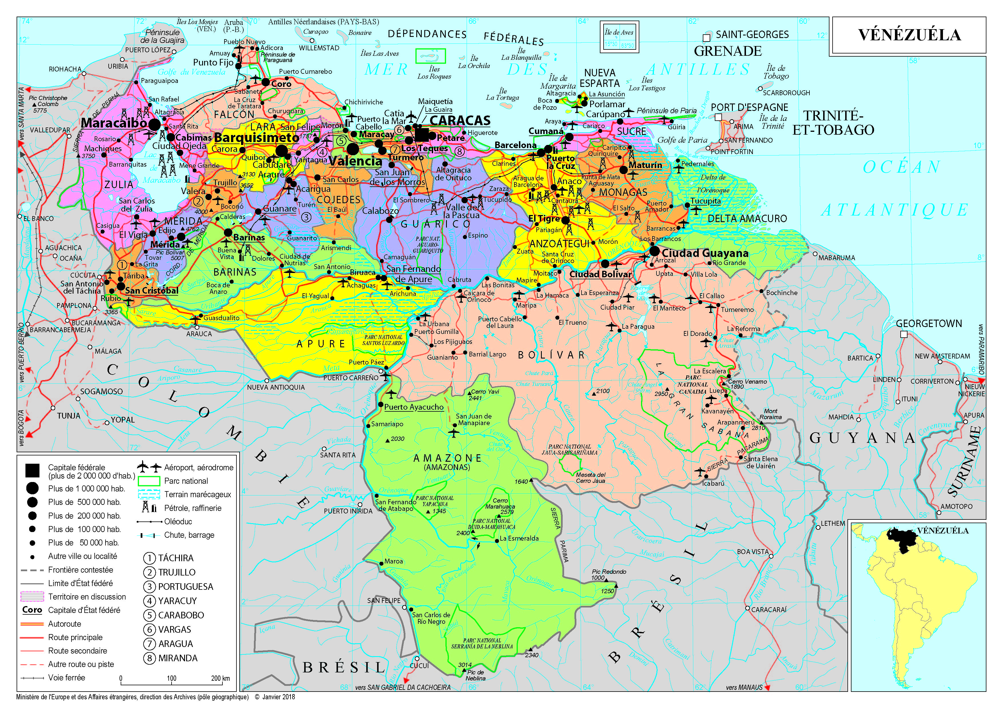 Vénézuéla Navigation latérale fiche pays Dans cette rubrique Vénézuéla Présentation du Vénézuéla Conseils aux voyageurs Dernières minutes et alertes Sécurité Entrée / séjour Santé Informations utiles Voyages d'affaires Contacts utiles Politique et économie Relations bilatérales Présentation du Vénézuéla Date de mise à jour le : 03 avril 2026 Information toujours valable à la date du jour Présentation du pays Données générales Nom officiel : République bolivarienne du VénézuélaNature du régime : République fédérale présidentielle Données géographiques Superficie : 912 050 km²Capitale : CaracasVilles principales : Maracaibo, Valencia, Barquisimeto, Maracay, Ciudad GuayanaLangue officielle : espagnolLangues courantes : environ 40 langues autochtones (wayuu, piaroa, pemón, guahibo, etc.)Monnaie : bolivar souverain.Fête nationale : 5 juillet, jour de l’Indépendance (1811) Données démographiques Population (2019) : 28,5 millions (source : Banque mondiale)Croissance démographique : -1,2 % en 2019 (Banque mondiale)Espérance de vie (2018) : 72,1 ans (hommes 68,4 ans ; femmes 76 ans) (Banque mondiale)Taux d’alphabétisation (2016) : 97,1 % - (PNUD)Religions : catholicisme (96 %), protestantisme (2 %), autres (2 %)Indice de développement humain 2019 : 0,711 (113e) (PNUD, rapport de décembre 2020)Indice d’inégalité de genre : 0,479 (119e mondial) (PNUD, rapport de décembre 2020) Politique intérieure Remportée par l’opposition, l’élection législative de 2015 marque le début d’une grave crise institutionnelle entre les pouvoirs exécutif et législatif, l’Assemblée nationale étant empêchée de légiférer. En 2016, l’opposition tente d’organiser un référendum révocatoire à l’encontre du président Maduro mais le Conseil national électoral parvient à en empêcher la tenue. En janvier 2017, le Parlement déclare le président Maduro en « abandon de charge », et en mars 2017 le Tribunal suprême de justice (TSJ) considère l’assemblée nationale en situation de « désobéissance » (« desacato »), une sentence qui vient parachever une série de décisions du TSJ dépossédant le Parlement de ses pouvoirs. Entre les mois de mars et d’août 2017, l’opposition se mobilise massivement, le bilan des troubles est évalué à 124 morts par le Haut Commissariat de l’ONU pour les droits de l’Homme. En août 2017, s’installe une Assemblée nationale constituante (ANC), qui supplante de facto l’Assemblée nationale pour légiférer, et dont l’élection n’est reconnue ni par l’Union européenne ni par la majorité des pays du continent américain. Le scrutin présidentiel du 20 mai 2018 se tient dans des conditions très controversées et il est boycotté par une majorité de l’opposition. Nicolas Maduro est réélu avec une abstention sans précédent (plus de 53 % selon les chiffres officiels). Le principal candidat d’opposition, Henri Falcon, rejette les résultats en dénonçant des irrégularités et le non-respect par le gouvernement des conditions agréées auparavant. L’Assemblée nationale ne reconnaît pas non plus le résultat. La France, l’Union européenne, de nombreux pays latino-américains (réunis dans le Groupe de Lima) et les États-Unis dénoncent un scrutin ni libre, ni transparent. Nicolas Maduro débute son deuxième mandat le 10 janvier 2019. Le 23 janvier 2019, Juan Guaido, président de l’Assemblée nationale vénézuélienne, se proclame président par intérim au nom d’une situation de vacance du pouvoir présidentiel. Le 4 février 2019, devant le refus de Nicolas Maduro de convoquer une nouvelle élection présidentielle, la France et la majorité des États membres de l’Union européenne annoncent considérer Juan Guaido comme le président par intérim en charge de l’organisation d’élections démocratiques. Les tentatives de négociation (notamment par la Norvège, à l’été 2019) n’aboutissent pas et l’Assemblée nationale demeure empêchée d’exercer son pouvoir législatif. Des élections législatives sont tenues le 6 décembre 2020, boycottées par les principaux partis d’opposition en raison d’irrégularités et relativement peu suivies (31 % de participation selon les chiffres officiels). Des députés du Parlement sortant, à majorité d’opposition, votent le 26 décembre 2020 la « continuité constitutionnelle » de l’Assemblée nationale pour un an supplémentaire. La répression menée par Nicolas Maduro à l’encontre de membres de l’opposition et de la société civile est par ailleurs dénoncée à plusieurs reprises par la France et l’UE. La Haute Commissaire de l’ONU pour les droits de l’Homme mène une mission sur place en juin 2019 et publie un rapport (juillet 2019) pointant la stratégie du pouvoir « visant à neutraliser, réprimer et incriminer les opposants politiques » et particulièrement l’usage disproportionné de la force (5 287 assassinats en 2018 par les forces spéciales de la police) ; un bureau de suivi des droits de l’Homme a été ouvert par la suite à Caracas. Politique étrangère La politique extérieure de la République bolivarienne du Vénézuéla se caractérise par son « anti-impérialisme », son tiers-mondisme et sa défense d’un monde multipolaire. L’opposition aux États-Unis a structuré la politique étrangère d’Hugo Chavez (président de 1999 à 2013) qui s’est rapproché de pays entretenant de relations difficiles avec Washington, en premier lieu l’Iran, la Chine et la Russie, ces deux derniers comptant parmi les principaux créanciers du Vénézuéla. La promotion d’une diplomatie Sud-Sud s’inscrit dans la continuité de la diplomatie vénézuélienne historique. Le Vénézuéla de Carlos Andrés Pérez (1974-1979 ; 1989-1993) était un membre influent du Mouvement des non-alignés, mouvement dont le Vénézuéla assume la présidence de 2016 à 2019. Le V