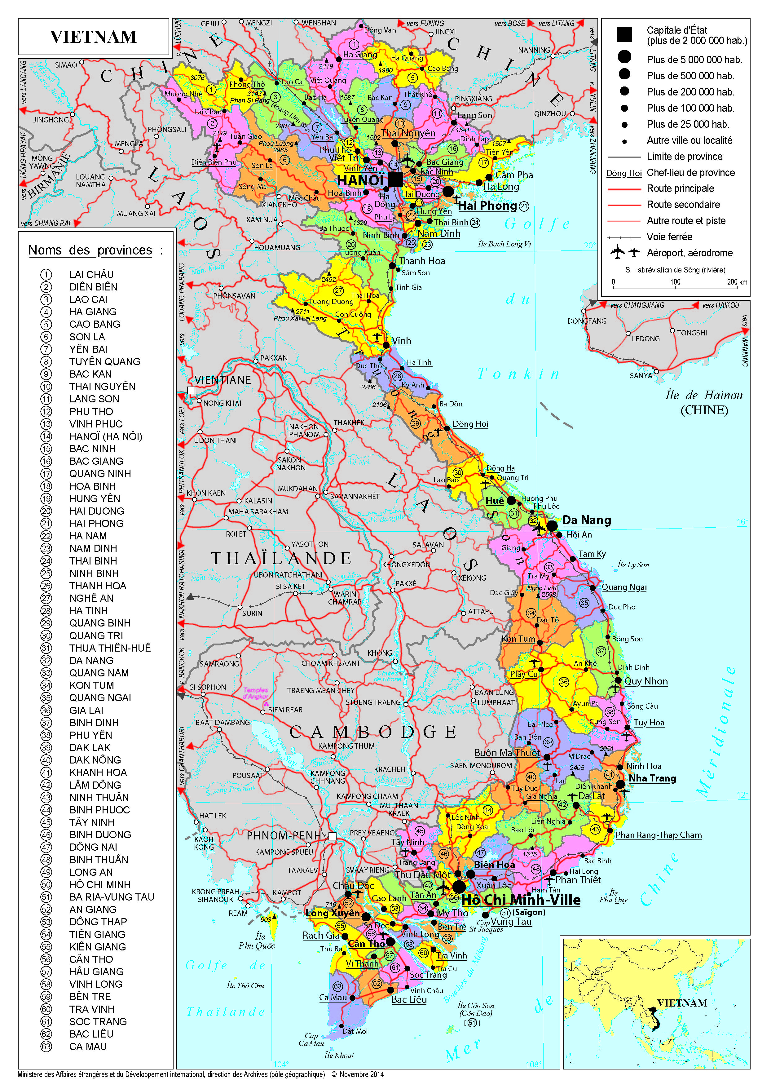 Vietnam Navigation latérale fiche pays Dans cette rubrique Vietnam Présentation du Vietnam Conseils aux voyageurs Dernières minutes et alertes Sécurité Entrée / séjour Santé Informations utiles Voyages d'affaires Contacts utiles Politique et économie Relations bilatérales Présentation du Vietnam Date de mise à jour le : 03 avril 2026 Information toujours valable à la date du jour Présentation du pays Données générales Nom officiel : République socialiste du VietnamNature du régime : Etat centralisé, régime de parti uniqueSecrétaire général du Parti communiste vietnamien et numéro 1 : Tô LâmPrésident de la République : Luong CuongPremier ministre : Pham Minh Chinh Données géographiques Superficie : 331 344 km²Capitale : Hanoï (8 718 000 habitants en 2024)Villes principales : Hô Chi Minh-ville (9 389 720 hab, Hanoi, Hai Phong (2 088 200) Can Tho (1 252 350), Bien Hoa (1 272 000 hab), Danang (1 220 190 hab).Langue officielle : vietnamienFête nationale : 2 septembreMonnaie : dong Données démographiques Population : 100,352,192 habitants (2023, Banque Mondiale)Croissance démographique : 0,7% par an (2023, Banque Mondiale)Espérance de vie : 75 ans (2023, Banque Mondiale)Taux d’alphabétisation : 96% (2022, Banque Mondiale)Religions : bouddhisme, catholicisme, bouddhisme, caodaïsme, protestantisme, islamIndice de développement humain : 0,726 (2022, PNUD) Politique intérieure Le Vietnam est une République socialiste dirigée par le Parti communiste vietnamien (PCV). Il s’agit d’un système d’Etat-parti, caractérisé par une grande stabilité politique, qui s’appuie sur un fort appareil sécuritaire.La préparation et la tenue du Congrès du Parti constituent, tous les cinq ans, la principale échéance politique au Vietnam. Le 13e Congrès s’est tenu en janvier 2021 et a renouvelé les instances dirigeantes (nouveau Comité central choisi par les 1500 délégués du Parti, élisant le Bureau politique et le Secrétaire général).Le gouvernement actuel, désigné à la suite du 13ème Congrès, a connu plusieurs changements mais reste dirigé par le Premier ministre Pham Minh Chinh. Le prochain Congrès aura lieu début 2026. Les élections législatives se tiennent également tous les 5 ans, après le Congrès. Les dernières élections se sont déroulées le 23 mai 2021 pour la mandature 2021-2026. Les députés sont élus au scrutin majoritaire plurinominal. Les candidats sont sélectionnés ou approuvés par le PCV. L’Assemblée nationale confirme par un vote les membres du gouvernement, remplit la fonction législative et assure un rôle de contrôle de l’action gouvernementale. Avec le Secrétaire général du Parti, le Président de la République et le Premier ministre, le Président de l’Assemblée nationale du Vietnam fait partie des quatre plus hauts dirigeants du Vietnam (Top 4). Le Président de l’Assemblée nationale est Tran Thanh Man depuis le 20 mai 2024. Ministre de la Sécurité publique depuis 2016, Tô Lâm est devenu Président de la République du Vietnam le 22 mai 2024. Il a succédé à Vo Van Thuong, qui a présenté sa démission en mars 2024. A la suite du décès du Secrétaire général Nguyen Phu Trong le 19 juillet 2024, Tô Lâm a été désigné le 3 août par le Comité central du Parti Communiste vietnamien comme nouveau Secrétaire général. Tô Lâm cumulait ainsi les fonctions de Secrétaire général du PCV et de Président de la République socialiste du Vietnam. L’ancien ministre de la Sécurité publique, Luong Cuong, a été nommé Président de la République le 21 octobre 2024. La situation intérieure a été marquée ces dernières années par une campagne de lutte contre la corruption qui a touché, à tous les niveaux, le Parti, l’Etat et le secteur privé. Politique étrangère Au Vietnam, les orientations de la politique étrangère sont les suivantes : indépendance, relations amicales avec tous et diversification des partenariats bilatéraux, défense du multilatéralisme, rôle constructif au sein de l’ASEAN.Dans le cadre de sa « diplomatie du bambou », le Vietnam recherche un équilibre entre ses grands partenaires, ce qui s’est traduit par la visite du président Joe Biden en septembre 2023, suivie par le président Xi Jinping en décembre. Le Vietnam également accueilli, en juin 2024, le président Vladimir Poutine. Hanoï a engagé depuis 2022 une diversification de ses principaux partenaires, labellisés « Partenaires Stratégiques Globaux ». Cette catégorie, initialement limitée à la Russie, la Chine et à l’Inde a été élargie à la Corée du Sud, aux Etats-Unis, au Japon, à l’Australie, à certains pays de l’ASEAN (Indonésie, Malaisie, Singapour), à l’Espagne et à la France. Sur le plan international, le Vietnam a fait le choix de l’ouverture politique et économique. Il est actif sur les sujets internationaux. Il a été élu membre non-permanent au Conseil de Sécurité en 2020-2021 et au Conseil des Droits de l’Homme pour le mandat 2023-2025. Il était l’hôte du sommet de l’APEC de Danang à l’automne 2017, a accueilli le sommet Donald Trump-Kim Jong Un en février 2019. Assumant la présidence de l’ASEAN en 2020, en pleine crise de la COVID-19, il a accueilli (en visioconférence) en novembre 2020 le 37ème Sommet de l’ASEAN et réunions connexes qui a notamment abouti à la signature du partenariat économique régional global (RCEP) liant les 10 pays de l’ASEAN à 5 de ses principaux partenaires dans la région indopacifique Chine, Japon, Corée du Sud, Australie et Nouvelle-Zélande formant désormais la plus grande zone de libre-échange au monde. Le Vietnam a des revendications en mer de Chine méridionale et s’inquiète de celles de la Chine, ainsi que de son assertivité croissante dans la zone. Tout en appelant au respect du droit international et de la Charte des Nations Unies, Hanoi s’est refusé à condam