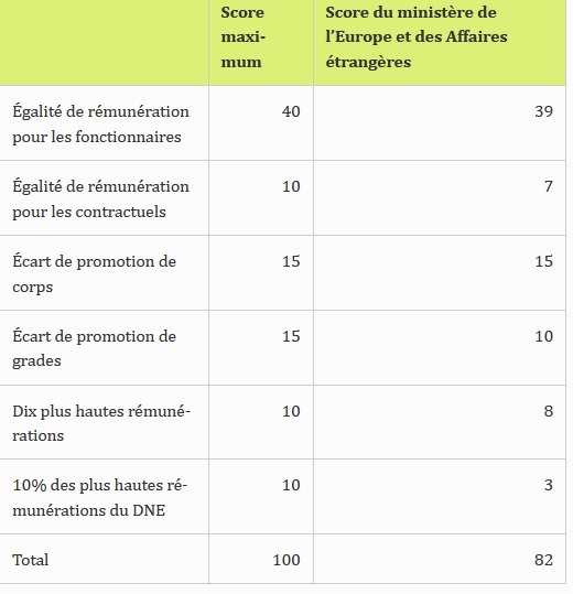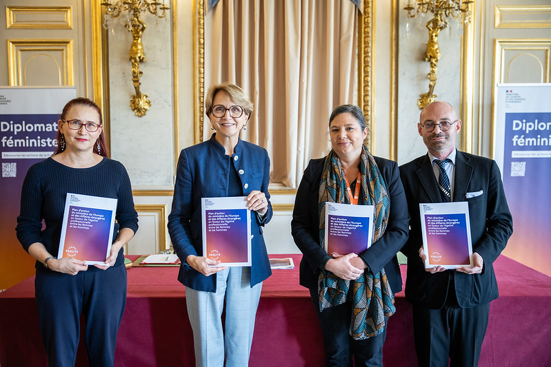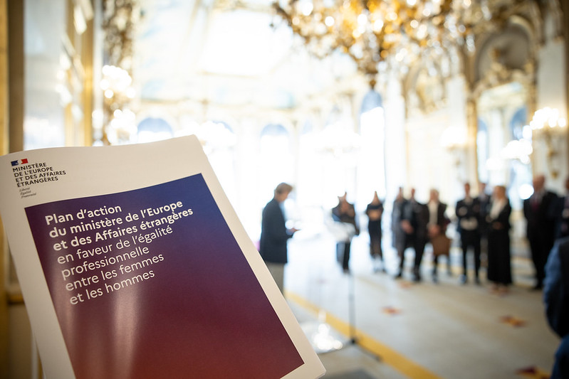 L’égalité femmes - hommes au ministère de l’Europe et des Affaires étrangères L’égalité entre les femmes et les hommes est l’une des priorités de la France. Au ministère de l’Europe et des affaires étrangères, cette question fait l’objet d’une double approche : en interne pour améliorer notre engagement dans ce domaine et dans le cadre de la politique extérieure de la France. Diplomatie féministe Publié le : 11 février 2026 Mis à jour le : 13 février 2026 Dans cette rubrique Le ministère en action Agir pour la paix et le respect des droits de l'homme Agir au sein de l'ONU Agir pour la sécurité, le désarmement et la non-prolifération Apporter une aide humanitaire d'urgence Forum de Paris sur la Paix Promouvoir les droits de l’homme Promouvoir l’égalité entre les femmes et les hommes dans le monde S'engager au sein d'une justice internationale Diplomatie numérique Accompagner les ressortissants français Placer l'information et la prévention au service de la sécurité Répondre aux crises et événements exceptionnels Services et démarches à l'étranger La communauté française à l’étranger en chiffres Le suivi des affaires individuelles sensibles Apporter une expertise médicale et psychologique Promouvoir une Europe souveraine La communauté politique européenne Les grandes politiques internes de l'Union européenne L'Europe de la défense La France et l'Union européenne Dossiers européens Promouvoir les entreprises françaises et l'attractivité de la France Attirer les investissements étrangers Attirer les étudiants internationaux Conforter la France comme première destination touristique Politique commerciale du gouvernement Promouvoir la France dans le domaine du sport Soutenir les chercheurs et la coopération scientifique au niveau international Soutenir les entreprises à l’export La France et ses partenaires économiques, pays par pays (2026) Promouvoir et soutenir l’innovation française Assurer la présence de la culture française Diplomatie culturelle Défendre la francophonie et la langue française Développer la présence de l’audiovisuel français dans le monde La coopération franco-allemande Soutenir les industries culturelles et créatives Contribuer à une mondialisation durable et équilibrée Répondre à l’urgence de la crise climatique et environnementale Lutter contre les inégalités mondiales Travailler avec les ONG et la société civile Mener des actions de coopération Sommets et enjeux globaux Stratégies régionales Sommaire Au sein du ministère, une politique volontariste en faveur de l’égalité professionnelle Index Égalité professionnelle : écarts de rémunération et promotions Un engagement reconnu par le label Égalité professionnelle Signature de la charte et de la convention #JamaisSansElles en faveur de l’égalité professionnelle entre les femmes et les hommes Ces interventions, complémentaires les unes des autres, se reflètent dans la Stratégie internationale de la France pour l’égalité entre les femmes et les hommes. Le Haut fonctionnaire à l’égalité des droits entre les femmes et les hommes, impulse, coordonne et anime l’action des différents services au ministère et à international en faveur de l’égalité. Cette politique est relayée et animée par un réseau de près de 230 référents et référentes égalité, en administration centrale et partout dans le monde. Au sein du ministère, une politique volontariste en faveur de l’égalité professionnelle Chef de file de la Stratégie internationale de la France pour une diplomatie féministe, notre ministère s’engage pour toujours davantage d’égalité entre les femmes et les hommes en son sein. C’est une condition de crédibilité de notre politique, mais aussi d’efficacité et de performance. Cet engagement porte ses fruits. Les primo-nominations de femmes sur des emplois supérieurs poursuivent leur progression : 34% en 2022, 40% en 2023, 46% en 2024. La même année, parmi les Ambassadeurs et Ambassadrices nommés pour la première fois, 52% étaient des femmes, portant à 36% la proportion de postes d’Ambassadeur/Ambassadrice occupés par des femmes en 2024. Les emplois de Consuls généraux connaissent une évolution comparable. Dans le haut encadrement en administration centrale, on compte 45% de femmes (sur les postes de secrétaire générale, directeurs généraux et directeurs d’administration centrale). Un plan d’action ambitieux Un nouveau plan d’action en faveur de l’égalité professionnelle entre les femmes et les hommes, qui couvrira les années 2024- 2026, a été signé par la Secrétaire générale et les organisations syndicales représentatives du ministère de l’Europe et des Affaires étrangères en septembre 2024. Succédant au plan d’action en faveur de l’égalité 2021-2023, le plan 2024-2026 s’articule autour de six axes d’effort : Toutes et tous égaux : sensibilisation systématique des agentes et des agents aux questions d’égalité, actions de communication plus offensives pour valoriser la place des femmes au sein du ministère et meilleur traitement des cas de violences sexuelles et sexuées, y compris dans le cadre privé. Un univers de métiers et de responsabilités : promouvoir davantage la mixité des métiers, poursuivre le rééquilibrage des viviers et garantir l’égal accès aux postes d’encadrement. À travail égal, salaire égal : réduction de l’écart de salaire lié à l’indemnité de résidence à l’étranger (IRE), les choix d’affectation étant souvent des choix genrés. Pour un équilibre vie privée - vie professionnelle : meilleure prise en compte de la situation personnelle des agents : parentalité, situation du conjoint ou de la conjointe lors d’un départ en poste, respect du temps de travail, etc. Mieux intégrer la santé féminine dans la prévention et la prise en charge médicale des age