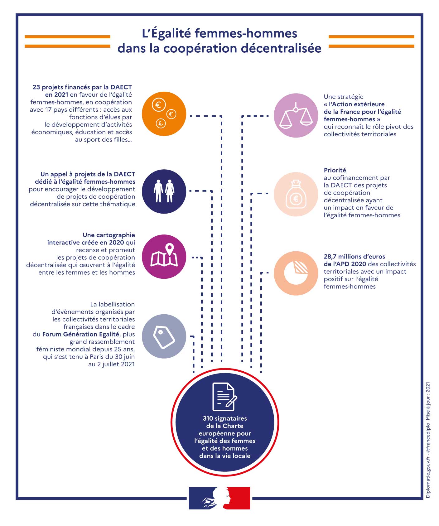 L’égalité femmes-hommes dans la coopération décentralisée L’égalité entre les femmes et les hommes est une priorité de la France. Cela se décline au ministère de l’Europe et des Affaires étrangères en une Stratégie internationale pour l’égalité entre les femmes et les hommes, qui concerne également l’action extérieure des collectivités territoriales ! Comment concevoir des projets de coopération décentralisée sur l’égalité femmes-hommes ? Coopération décentralisée Publié le : 29 octobre 2025 Mis à jour le : 05 mars 2026 Dans cette rubrique Le ministère en action Agir pour la paix et le respect des droits de l'homme Agir au sein de l'ONU Agir pour la sécurité, le désarmement et la non-prolifération Apporter une aide humanitaire d'urgence Forum de Paris sur la Paix Promouvoir les droits de l’homme Promouvoir l’égalité entre les femmes et les hommes dans le monde S'engager au sein d'une justice internationale Diplomatie numérique Accompagner les ressortissants français Placer l'information et la prévention au service de la sécurité Répondre aux crises et événements exceptionnels Services et démarches à l'étranger La communauté française à l’étranger en chiffres Le suivi des affaires individuelles sensibles Apporter une expertise médicale et psychologique Promouvoir une Europe souveraine La communauté politique européenne Les grandes politiques internes de l'Union européenne L'Europe de la défense La France et l'Union européenne Dossiers européens Promouvoir les entreprises françaises et l'attractivité de la France Attirer les investissements étrangers Attirer les étudiants internationaux Conforter la France comme première destination touristique Politique commerciale du gouvernement Promouvoir la France dans le domaine du sport Soutenir les chercheurs et la coopération scientifique au niveau international Soutenir les entreprises à l’export La France et ses partenaires économiques, pays par pays (2026) Promouvoir et soutenir l’innovation française Assurer la présence de la culture française Diplomatie culturelle Défendre la francophonie et la langue française Développer la présence de l’audiovisuel français dans le monde La coopération franco-allemande Soutenir les industries culturelles et créatives Contribuer à une mondialisation durable et équilibrée Répondre à l’urgence de la crise climatique et environnementale Lutter contre les inégalités mondiales Travailler avec les ONG et la société civile Mener des actions de coopération Sommets et enjeux globaux Stratégies régionales Sommaire Les outils de la DCTCIV pour l’égalité femmes-hommes dans la coopération décentralisée Pour aller plus loin Lors du Comité interministériel de la coopération internationale et du développement (CICID) du 8 février 2018, la France a réaffirmé son engagement en faveur de l’égalité femmes-hommes ; le Président de la République, Emmanuel Macron, en a fait un des enjeux de son quinquennat. Le gouvernement a également adopté la stratégie internationale de la France pour l’égalité entre les femmes et les hommes 2025-2030. Celle-ci vise à mettre fin à toutes formes de discriminations et de violences faites aux femmes et aux filles, à soutenir l’autonomisation des femmes, y compris financière, et à accompagner les pays dans leur transition démographique (santé sexuelle et reproductive, éducation des filles, etc.). Dans ce cadre, les collectivités territoriales, en tant qu’institutions publiques de proximité, sont des acteurs de premier plan pour faire de l’égalité femmes-hommes une réalité pour les territoires et les citoyens et les citoyennes. Les collectivités françaises sont particulièrement engagées sur leur territoire en faveur de l’égalité – plus de 360 collectivités françaises sont signataires de la Charte européenne pour l’égalité des femmes et des hommes dans la vie locale –, mais également à l’international, en lien avec leurs collectivités partenaires – 69% des dépenses APD des collectivités territoriales en 2022 des collectivités territoriales avec un impact positif sur l’égalité femmes-hommes (marqueur genre 1 ou 2) dont 5,6% de marqueur genre 2. Le ministère de l’Europe et des Affaires étrangères encourage les collectivités territoriales françaises et leurs partenaires à mettre cette approche au cœur de leurs partenariats de coopération décentralisée, en tant qu’enjeu majeur pour le développement d’un territoire, mais également comme facteur clef de réussite d’un projet : impliquer les femmes dans les projets de coopération décentralisée, quelle que soit la thématique, c’est ainsi participer à leur autonomisation, au renforcement de leur capacité mais aussi à l’internationalisation de l’ensemble du territoire. Par l’échange de bonnes pratiques ainsi que par la prise en compte de manière systématique de l’égalité femmes-hommes comme un facteur de développement socio-économique d’un territoire, la coopération décentralisée permet d’aborder le concept d’égalité de manière innovante, tout en interrogeant nos pratiques, dans les pays du Nord comme du Sud. Transcription Fermer la transcription L'Egalité femmes-hommes dans la coopération décentralisée 310 signataires de la Charte européenne pour l'égalité des femmes et des hommes dans la vie locale 23 projets financés par la DAECT en 2021 en faveur de l'égalité femmes-hommes, en coopération avec 17 pays différents : accès aux fonctions d'élues par le développement d'activités économiques, éducation et accès au sport des filles... Une stratégie "l'Action extérieure de la France pour l'égalité femmes-hommes" qui reconnait le rôle pivot des collectivités territoriales Priorité au cofinancement par la DAECT des projets de coopération décentralisée ayant un impact en faveur de l'égalité fe