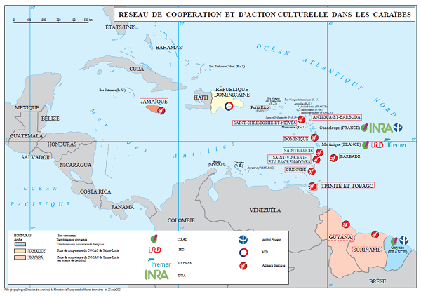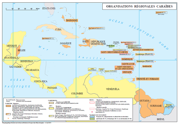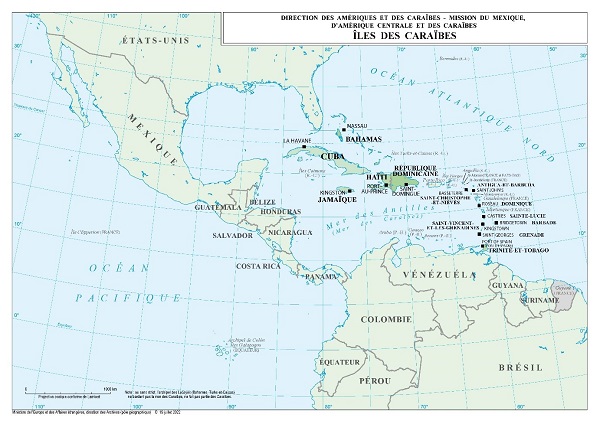 La France et les Caraïbes La France est présente dans les Caraïbes à travers les collectivités françaises d’Amérique (CFA) : la Guadeloupe, la Guyane, la Martinique, Saint-Barthélemy et Saint-Martin. Fortement ancrée dans cette région, elle a noué, au fil des ans, des liens historiques et culturels étroits avec le bassin caribéen. La France partage avec ses voisins de la région des problématiques communes, en particulier sur les plans climatique et environnemental. Elle est très attentive aux opportunités de développement de ses relations avec les pays de la Caraïbe, et noue des coopérations bilatérales et multilatérales dynamiques dans plusieurs domaines (développement durable, coopérations culturelle, sécuritaire, sanitaire, universitaire, formation professionnelle). Amériques Publié le : 17 novembre 2025 Mis à jour le : 18 mars 2026 Dans cette rubrique Le ministère en action Agir pour la paix et le respect des droits de l'homme Agir au sein de l'ONU Agir pour la sécurité, le désarmement et la non-prolifération Apporter une aide humanitaire d'urgence Promouvoir les droits de l’homme Promouvoir l’égalité entre les femmes et les hommes dans le monde S'engager au sein d'une justice internationale Diplomatie numérique Accompagner les ressortissants français Placer l'information et la prévention au service de la sécurité Répondre aux crises et événements exceptionnels Services et démarches à l'étranger La communauté française à l’étranger en chiffres Le suivi des affaires individuelles sensibles Apporter une expertise médicale et psychologique Promouvoir une Europe souveraine La communauté politique européenne Les grandes politiques internes de l'Union européenne L'Europe de la défense La France et l'Union européenne L’Europe en BD : 13 planches pour retracer la construction européenne Dossiers européens Promouvoir les entreprises françaises et l'attractivité de la France Attirer les investissements étrangers Attirer les étudiants internationaux Conforter la France comme première destination touristique Politique commerciale du gouvernement Promouvoir la France dans le domaine du sport Soutenir les chercheurs et la coopération scientifique au niveau international Soutenir les entreprises à l’export La France et ses partenaires économiques, pays par pays (2026) Promouvoir et soutenir l’innovation française Assurer la présence de la culture française Diplomatie culturelle Défendre la francophonie et la langue française Développer la présence de l’audiovisuel français dans le monde La coopération franco-allemande Soutenir les industries culturelles et créatives La France accueille le XIXe Sommet de la Francophonie sous le signe de la création et de l’innovation Contribuer à une mondialisation durable et équilibrée Répondre à l’urgence de la crise climatique et environnementale Lutter contre les inégalités mondiales Travailler avec les ONG et la société civile Mener des actions de coopération décentralisée Sommets et enjeux globaux Stratégies régionales Sommaire Géographie de l’espace Caraïbe : une région hétérogène malgré des problématiques communes L’intégration régionale, une priorité de la France dans le bassin caribéen Culture, éducation et Francophonie : de solides piliers de coopération Des opportunités à saisir pour les entreprises françaises En liaison avec les collectivités régionales dans le cadre des compétences qui leur sont dévolues, la contribution française au développement des territoires caribéens, voisins de ses collectivités d’outre-mer, participe à la sécurité régionale et encourage les échanges commerciaux. Cela permet aussi de renforcer les liens culturels et éducatifs qui unissent la France à une région comptant 1 million de Français et Françaises et plus de 10 millions de francophones et créolophones à base lexicale française. Géographie de l’espace Caraïbe : une région hétérogène malgré des problématiques communes L’espace caraïbe est un bassin s’étendant sur 4 millions de km2, composé de petits États insulaires en développement (PEID) et de 7 collectivités d’outre-mer aux statuts différents. La France y est présente au travers des collectivités françaises des Amériques : la Guadeloupe, la Guyane, la Martinique, Saint-Barthélemy et Saint-Martin. Elles représentent 1 million de Français. Cet ensemble présente des caractéristiques insulaires communes mais n’est pas homogène. La région se divise en plusieurs sous-ensembles : la Caraïbe anglophone, la Caraïbe hispanophone, la Caraïbe orientale (mêlant territoires francophones et anglophones), Haïti, seul pays moins avancé (PMA) de la zone. Cet émiettement se traduit par une hétérogénéité d’abord démographique, mais aussi économique, linguistique et institutionnelle (certains États sont indépendants quand d’autres territoires sont associés à des États européens), sans compter les coûts de transport intra-caribéens qui freinent considérablement l’intégration régionale. La France dispose de 8 ambassades dans la région : à Cuba, en Haïti, en Jamaïque, au Panama (compétente pour les Bahamas), en République dominicaine, à Sainte-Lucie (compétente pour les 6 pays de l’OECO et la Barbade), au Suriname (compétent pour le Guyana), à Trinité-et-Tobago. L’intégration régionale, une priorité de la France dans le bassin caribéen La diversité du bassin caribéen se reflète dans son adhésion à diverses organisations régionales et son architecture institutionnelle repose sur 3 organisations principales dans lesquelles la France est représentée respectivement par ses ambassades à Castries, Paramaribo et Port d’Espagne : l’Association des États de la Caraïbe (AEC) dont la France est membre associé au titre de la Guyane et de Saint-Barthélemy. La Guadeloupe, la Martinique et Saint Martin é