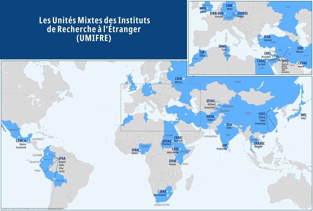 Le réseau des UMIFRE (Unités mixtes de recherche à l’étranger) Les UMIFRE (Unités mixtes de recherche à l’étranger) sont des instituts de recherche spécialisés en sciences humaines et sociales. Ils constituent un réseau international de 27 instituts majoritairement gérés par le ministère de l’Europe et des Affaires étrangères en cotutelle avec le CNRS. Diplomatie scientifique Publié le : 23 mai 2025 Mis à jour le : 09 mars 2026 Dans cette rubrique Le ministère en action Agir pour la paix et le respect des droits de l'homme Agir au sein de l'ONU Agir pour la sécurité, le désarmement et la non-prolifération Apporter une aide humanitaire d'urgence Forum de Paris sur la Paix Promouvoir les droits de l’homme Promouvoir l’égalité entre les femmes et les hommes dans le monde S'engager au sein d'une justice internationale Diplomatie numérique Accompagner les ressortissants français Placer l'information et la prévention au service de la sécurité Répondre aux crises et événements exceptionnels Services et démarches à l'étranger La communauté française à l’étranger en chiffres Le suivi des affaires individuelles sensibles Apporter une expertise médicale et psychologique Promouvoir une Europe souveraine La communauté politique européenne Les grandes politiques internes de l'Union européenne L'Europe de la défense La France et l'Union européenne Dossiers européens Promouvoir les entreprises françaises et l'attractivité de la France Attirer les investissements étrangers Attirer les étudiants internationaux Conforter la France comme première destination touristique Politique commerciale du gouvernement Promouvoir la France dans le domaine du sport Soutenir les chercheurs et la coopération scientifique au niveau international Soutenir les entreprises à l’export La France et ses partenaires économiques, pays par pays (2026) Promouvoir et soutenir l’innovation française Assurer la présence de la culture française Diplomatie culturelle Défendre la francophonie et la langue française Développer la présence de l’audiovisuel français dans le monde La coopération franco-allemande Soutenir les industries culturelles et créatives Contribuer à une mondialisation durable et équilibrée Répondre à l’urgence de la crise climatique et environnementale Lutter contre les inégalités mondiales Travailler avec les ONG et la société civile Mener des actions de coopération Sommets et enjeux globaux Stratégies régionales Sommaire Comment intégrer le réseau ? Pour en savoir plus : Les UMIFRE sont réparties dans plus de 30 pays en Europe, en Afrique, au Moyen-Orient, en Asie et en Amérique latine. Ces unités de recherche constituent un outil unique au monde au service de la diplomatie scientifique de la France. Télécharger la transcription textuelle de l’infographie PDF - 185.4 KB Les UMIFRE développent des programmes de recherche liés à l’histoire des civilisations comme aux enjeux du monde contemporain. Elles sont interdisciplinaires et allient histoire, archéologie, économie, géographie, linguistique, sciences politiques… Elles sont investies dans la recherche de terrain, la formation, la diffusion scientifique et le débat d’idées. Les UMIFRE constituent de formidables observatoires des crises et des transitions politiques, économiques et sociales des régions dans lesquelles elles sont implantées. Elles sont aussi l’expression de la richesse et de la diversité de la pensée scientifique française dans le domaine des sciences humaines et sociales. En formant, au travers des écoles doctorales, des bourses, etc., les chercheurs et les décideurs de demain, les UMIFRE facilitent les relations intergouvernementales et contribuent au rayonnement de la France dans le monde. En effet, leur présence sur le terrain permet de tisser des relations de confiance entre les communautés de chercheurs ces liens qui s’avèrent particulièrement précieux lorsque le contexte politique rend difficiles les échanges diplomatiques. Comment intégrer le réseau ? Si vous êtes chercheur ou chercheuse Plusieurs possibilités sont offertes : vous pouvez effectuer une mission de longue durée (sur un poste de chercheur ou chercheuse du ministère de l’Europe et des Affaires étrangères ou une délégation ou une affectation du CNRS) ou y séjourner quelques mois (grâce au soutien à la mobilité internationale du CNRS…), ou encore être reconnu comme chercheur associé. Si vous êtes étudiant ou étudiante en master ou doctorat Des bourses d’aide à la mobilité sont proposées par les UMIFRE et le CNRS. Informez-vous auprès de votre établissement sur les possibilités d’échange, y compris avec les partenaires locaux des UMIFRE. Consultez les axes de recherche de chaque UMIFRE sur le site internet, et choisissez la vôtre ! Pour en savoir plus : Europe / Asie centrale CMB (Allemagne, Berlin) IFRA-SHS (Allemagne, Francfort) MFO (Royaume-Uni) CEFRES (République tchèque) CEFR (Russie) IFEA-Istanbul (Turquie) IFEAC (Kirghizstan / Tadjikistan) Afrique / Moyen-Orient IRMC (Tunisie) CJB (Maroc) CEDEJ (Égypte / Soudan) CRFJ (Israël) CEFAS (Koweit) IFRI (Iran) IFPO (Irak / Territoires palestiniens / Jordanie / Liban) DAFA (Afghanistan) IFRA (Kénya) IFRA (Nigéria) SFDAS (Soudan) CFEE (Éthiopie) IFAS-Recherche (Afrique du Sud) Amérique CEMCA (Guatémala / Mexique) IFEA-Andes (Bolivie / Colombie / Équateur / Pérou) Asie Ireja à la MFJ (Japon) CEFC (Chine / Taïwan) IRASEC (Thaïlande) CSH (Inde, New Delhi) IFP (Inde, Pondichéry)