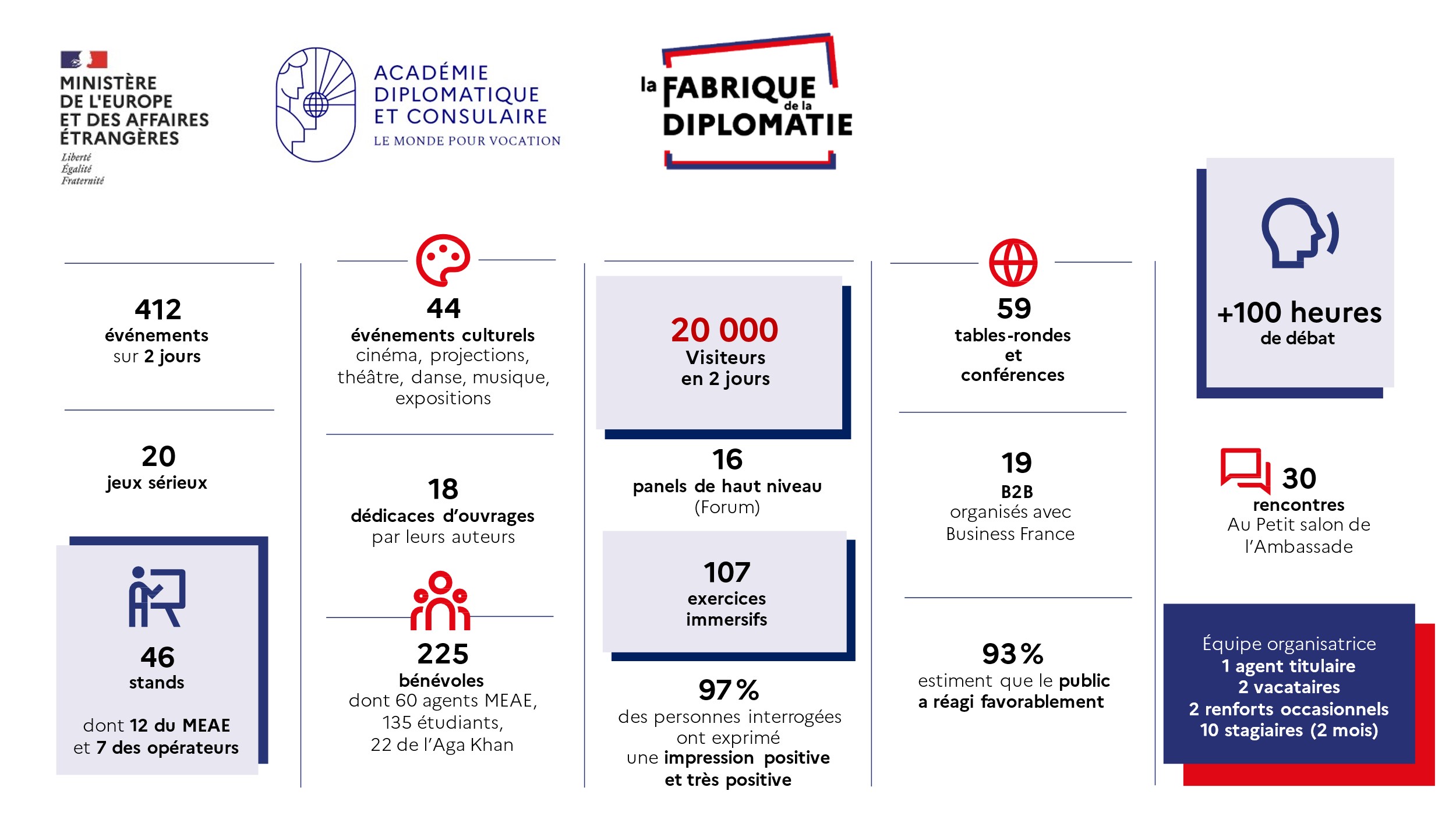 La Fabrique de la diplomatie La Fabrique de la Diplomatie est un événement grand public inédit porté par le ministère de l’Europe et des Affaires étrangères visant à rendre visible, intelligible et accessible l’action diplomatique française. Ouvert à tous, gratuit et sans inscription, ce forum réunit institutions, chercheurs, acteurs de la société civile et citoyens afin de débattre des grands enjeux internationaux et de valoriser la diversité des métiers de la diplomatie. Travailler au ministère Publié le : 16 mai 2025 Mis à jour le : 04 mars 2026 Crédits : MEAE Dans cette rubrique Administration Centre de crise et de soutien Accompagner les opérateurs de l’État et les entreprises Faire connaître les services : Conseils aux voyageurs et Fil d’Ariane Stabiliser les pays en sortie de crise Centre d'analyse, de prévision et de stratégie Centre d’analyse de prévision et de stratégie (CAPS) : 50 ans d’histoire Le réseau du CAPS Podcast « Sources diplomatiques » nouvelle série : Book Club du CAPS Programme d’invitation des personnalités d’avenir (PIPA) Protocole d’État et des événements diplomatiques Direction des affaires juridiques Les accords et traités internationaux Académie diplomatique et consulaire Académie diplomatique d’été Collège des hautes études de l’Institut diplomatique La Fabrique de la diplomatie Le Prix de thèse de l’Académie diplomatique Le Prix du Quai d’Orsay Le Prix du mémoire sur la Chine contemporaine Les Petits et Grands Séminaires Réserve diplomatique citoyenne La première édition, organisée en septembre de 2025, a rassemblé 20 000 visiteurs en deux jours et a démontré sa capacité à mobiliser un large écosystème autour d’une diplomatie moderne, participative et inclusive. La prochaine édition de la Fabrique de la Diplomatie aura lieu les 4 et 5 septembre de 2026. Sommaire Qu’est-ce que la Fabrique de la diplomatie ? Pour une diplomatie innovante au service des citoyens Autour de 6 grandes thématiques En présence de nombreux acteurs Suivez l’événement sur les réseaux sociaux Transcription Fermer la transcription 412 évènements sur 2 jours 44 évènements culturels cinéma, projections, théâtre, danse, musique, expositions 20 000 Visiteurs en 2 jours 59 tables-rondes et conférences +100 heures de débat 20 jeux sérieux 18 dédicaces d'ouvrages par leurs auteurs 16 panels de haut niveau ( Forum) 19 B2B organisés avec Business France 30 rencontres au Petit salon de l'Ambassade 46 stands dont 12 du MEAE et 7 des opérateurs 225 bénévoles dont 60 agents MEAE, 135 étudiants, 22 de l'Aga Khan 107 exercices immersifs 93% estiment que le public a régi favorablement Équipe organisatrice : 1 agent titulaire, 2 vacataires, 2 renforts occasionnels, 10 stagiaires (2mois) Qu’est-ce que la Fabrique de la diplomatie ? La Fabrique de la Diplomatie est un événement grand public inédit porté par le ministère de l’Europe et des Affaires étrangères visant à rendre visible, intelligible et accessible l’action diplomatique française. Ouvert à tous, gratuit et sans inscription, ce forum réunit institutions, chercheurs, acteurs de la société civile et citoyens afin de débattre des grands enjeux internationaux et de valoriser la diversité des métiers de la diplomatie. La fabrique de la diplomatie propose une plongée au cœur des enjeux internationaux et des métiers qui façonnent la politique étrangère de la France avec trois grands objectifs : Changer le regard des Français sur la politique étrangère de la France. Mettre en lumière la place et les enjeux de l’Union européenne pour la diplomatie française. S’enrichir de l’expertise des acteurs de l’action internationale. Pour une diplomatie innovante au service des citoyens Ce grand événement, ouvert à tous les publics, réunira autour du ministère l’ensemble des parties prenantes de l’action internationale de la France.Moment fédérateur en interne, démonstration de la diversité des talents auprès de nos compatriotes, ce grand rendez-vous annuel vise également à susciter des vocations et à préparer la relève générationnelle. Regardez notre vidéo ! Autour de 6 grandes thématiques Transcription Fermer la transcription Protéger Représenter Communiquer Décrypter Promouvoir Négocier En présence de nombreux acteurs Acteurs publics institutionnels (ministères, Parlement, collectivités locales…) Opérateurs de l’action internationale de la France Acteurs d’institutions de l’Union européenne Organisations internationales et corps diplomatique Secteur privé et acteurs de la coopération économique (entreprises, chambres de commerce, syndicats) Monde académique et think tanks (universités, instituts de recherche…) Société civile (ONG, réseaux d’expatriés, diasporas, organisations étudiantes…) Transcription Fermer la transcription Sorbonne nouvelle Académie de défense de l'école militaire AFD Business France RFI France24 Cirad AEFE Institut français Atout France France volontaires Expertise France CFI IRD Campus France Suivez l’événement sur les réseaux sociaux