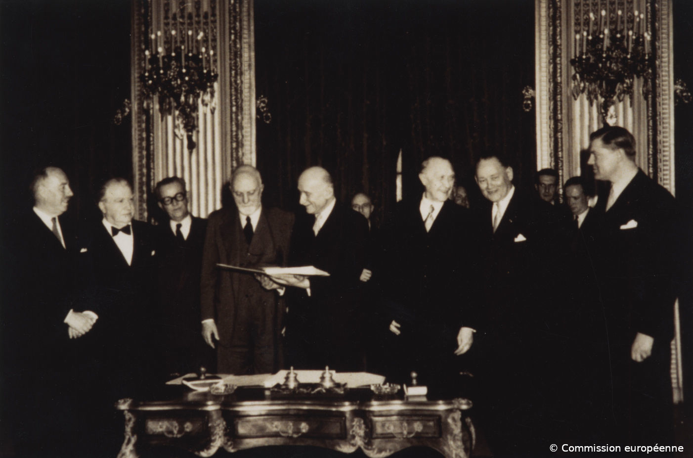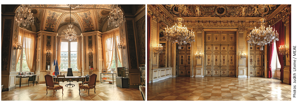 Le Quai d’Orsay Depuis le milieu du XIXe siècle, l’adresse principale du ministère des Affaires étrangères – aujourd’hui ministère de l’Europe et des Affaires étrangères - se situe au 37 Quai d’Orsay dans le VIIème arrondissement de Paris. C’est à cette stabilité de plus d’un siècle et demi que l’on doit l’expression courante " Quai d’Orsay " pour désigner le ministère des Affaires étrangères. Le ministère et son réseau Publié le : 05 mai 2025 Mis à jour le : 30 mars 2026 Dans cette rubrique Lieux emblématiques Le Quai d’Orsay Les archives diplomatiques Le site de Convention Le château de La Celle-Saint-Cloud Villas culturelles françaises Label Patrimoine et Diplomatie Sommaire La façade nord Rez-de-chaussée Premier étage Les salles de bain royales Lieu d'histoire et de mémoire Un bâtiment dédié à l'activité diplomatique Le projet de construction d’un bâtiment dédié à héberger l’activité diplomatique — il s’agit du premier édifice officiel de la République française construit spécifiquement pour abriter les services d’un ministère précis — a été initié par François Guizot, ministre des Affaires étrangères sous la monarchie de juillet, en 1845. Le projet est confié à l’architecte Jacques Lacornée. Son programme, établi par Guizot, était constitué de quatre parties : l’hôtel du ministre, des bureaux administratifs, les bureaux des archives et les archives proprement dites. S’y ajoutaient un jardin, des écuries et des remises. Un moment freinés par la révolution de 1848, les travaux furent repris à l’instigation de l’empereur Napoléon III et seront achevés en 1855. L’hôtel du Ministre Une fois le gros œuvre achevé en 1853, on fit appel, pour la décoration intérieure de l’hôtel du Ministre, à des artistes connus à l’époque, tels que Séchan, Nolau et Rubé, Molknecht, Lavigne, Liénard, Hippolyte Adam, les frères Huber… L’hôtel étant destiné à recevoir des souverains et diplomates étrangers, il convenait de les accueillir avec tout le faste dû à leur rang. L’édifice a ainsi fait l’objet d’une grande attention en termes de décoration. Les travaux de décoration extérieure furent confiés à des sculpteurs expérimentés qui, pour la plupart, avaient déjà participé à la construction ou à la restauration d’églises (Notre-Dame de Paris, Saint-Vincent de Paul…) ou de châteaux (Blois, Saint-Cloud…). La façade nord Le bâtiment devant faire face au fleuve, l’architecte jugea préférable, à l’encontre des règles admises, de ne pas situer l’entrée du palais sur la partie centrale, afin de faire bénéficier les grandes salles de réception d’une vue agréable sur la Seine, entre les ponts Alexandre III et de la Concorde. Les entrées sont donc placées sur les côtés : l’une à droite formant l’entrée principale, l’autre à gauche pouvant servir de sortie, mais surtout destinée à établir la symétrie de la façade. C’est à Hubert Lavigne que l’on doit les bas-reliefs en bois sur les tympans des portes d’entrée de la façade. Ils représentent le génie de la Paix et le génie de la Guerre soutenant une couronne impériale. Quant aux statues dans les niches, elles sont l’œuvre de Triqueti et représentent les quatre continents. Commandées dès la construction de l’Hôtel, elles ne furent installées qu’en 1870. Les croisées du premier étage sont surmontées de médaillons en marbre où devaient être représentées les armes des différentes puissances, mais ce projet est resté inabouti. Une balustrade à l’italienne couronne la construction. Rez-de-chaussée Depuis la construction du palais, l’usage du rez-de-chaussée n’a pratiquement pas varié. Selon le projet de l’architecte Jacques Lacornée, on devait y trouver le cabinet du ministre, des salles d’attente, le secrétariat ainsi que des pièces de réception, réparties en trois grands salons et une salle à manger. Sous le Second Empire, les salons reçurent les délégations venues assister à des conférences internationales, comme le congrès de Paris de 1856 qui mit fin à la guerre de Crimée et constitua le premier grand événement diplomatique accueilli par le bâtiment tout juste achevé. Un grand tableau d’Edouard Dubufe réalisé en 1857 en commémore le souvenir. Déposé par le Château de Versailles, il est aujourd’hui exposé dans le salon des huissiers. Sous le Second Empire et la Troisième République, les salons servirent également de cadre à des réceptions recherchées et à des concerts. Premier étage Réservé à l’origine à l’usage privé du ministre, le premier étage a servi, dès le début du XXe siècle, de résidence aux hôtes officiels de la France. Pendant longtemps, souverains, chefs d’État et Premiers ministres en visite officielle à Paris ont été logés dans ces appartements. Têtes couronnées d’Angleterre ou de Perse, émirs d’Arabie ou dirigeants politiques occidentaux s’y sont succédé. Juan Carlos, Roi d’Espagne, en fut le dernier hôte de marque en 1973. À chaque visite, le décor des appartements était adapté à la personnalité reçue. Mais hormis des travaux d’entretien et de restauration, ou la construction de remarquables salles de bains de style art déco en 1938, les lieux n’ont pas subi de changement notoire depuis leur construction. Désormais, le premier étage accueille des réunions et des réceptions. Les salles de bain royales Les salles de bain, dites du roi et de la reine, ont été créées en 1938 pour la venue en France du roi d’Angleterre, George VI et de la reine Elizabeth. Ces salles de bains s’intégraient dans un programme général de rénovation et de modernisation de l’Hôtel du ministre des Affaires étrangères. La vétusté des bâtiments construits sous Louis-Philippe exigeait des travaux extérieurs et intérieurs. Le chantier 
