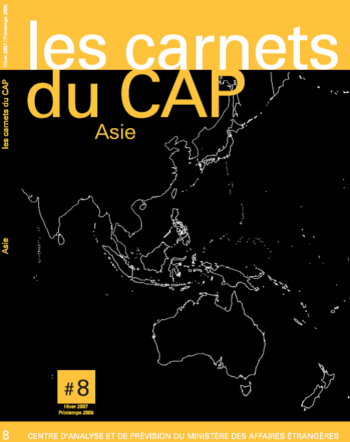 Les carnets du CAPS n° 8 : Asie 2025 Asie Enjeux globaux Date de publication : Hiver 2007 - Printemps 2008 Dernière mise à jour le : 10 février 2026 Dans le prolongement de numéros précédents consacrés à l'Europe, au Moyen-Orient, à l'Amérique, il était temps sans doute pour les Carnets du CAP de s'intéresser à l'Asie. Sommaire Télécharger la Préface PDF - 23.8 KB Asie Asie 2025 : Télécharger La Chine PDF - 110.5 KB l’Inde le Japon Problématiques stratégiques Les élections du 18 février 2008 au Pakistan Culture de l’opium en Afghanistan : éradication ou légalisation ? Les quatre points cardinaux de la diplomatie indienne Actualité Doutes américains à l’égard de leur politique étrangère Éclairage Subprimes, surprises… Grand angle Carnet de chèques et carnet d’adresses Les mots de la diplomatie Télécharger L’Orient, une fiction compliquée PDF - 38.0 KB Relecture 1998 : les essais nucléaires indiens et pakistanais 3 questions à… Sam Muller