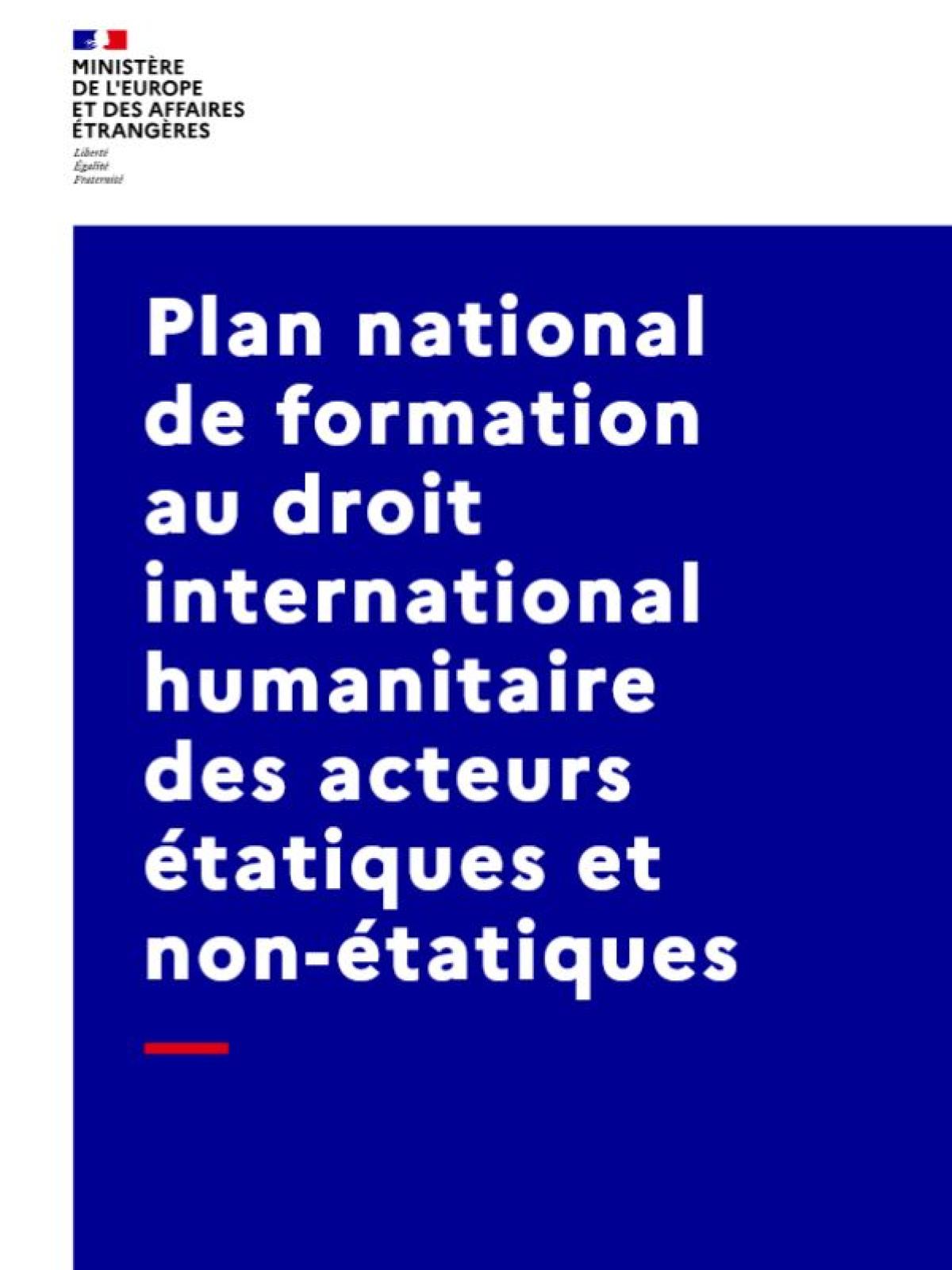Plan national de formation au droit international humanitaire Action humanitaire Date de publication : 21 novembre 2025 Dernière mise à jour le : 20 mars 2026 Le Plan national de formation au droit international humanitaire, rédigé par le ministère de l’Europe et des Affaires étrangères en étroite consultation avec plusieurs ministères et des acteurs de la société civile, est un outil majeur de promotion du droit international humanitaire (DIH). Le Plan prévoit de renforcer la formation au DIH des acteurs étatiques français (y compris diplomates et militaires) qui sont amenés à traiter de ces questions. Il vise également à présenter et à renforcer les formations au DIH dispensées par la France à l’intention des forces armées partenaires mais aussi des ONG et des grandes entreprises françaises intéressées. S’inscrivant dans le cadre de l’Appel à l’action humanitaire, lancé par la France et l’Allemagne en septembre 2019, il constitue une déclinaison concrète de l’engagement de la France sur les questions humanitaires. Plan national de formation au droit international humanitaire Télécharger le Plan national de formation au droit international humanitaire JPG - 52.7 KB