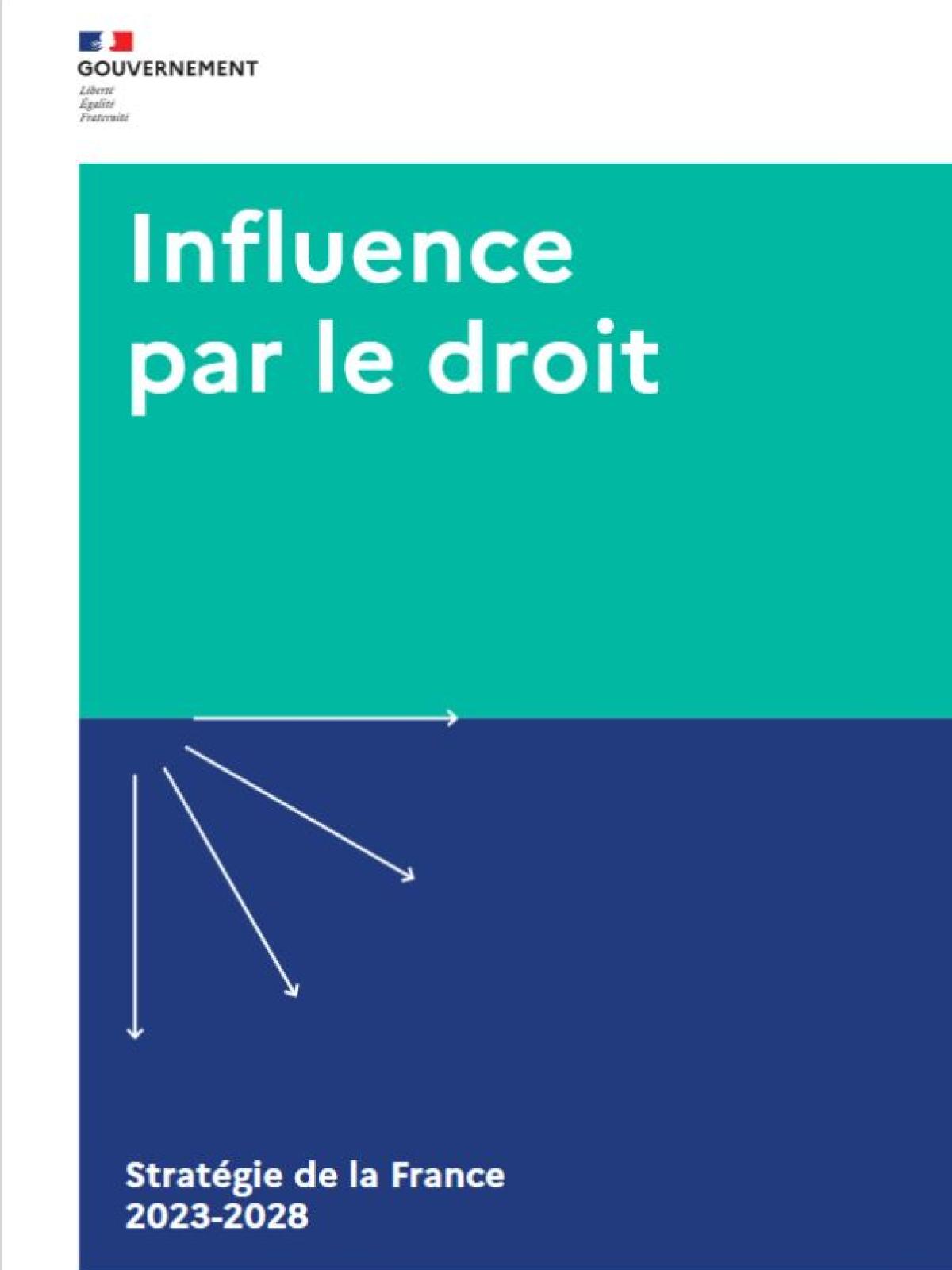 Stratégie d’influence par le droit Diplomatie d’influence Date de publication : 01 mars 2023 Dernière mise à jour le : 12 février 2026 Le ministère de l’Europe et des Affaires étrangères présente conjointement avec le ministère de la Justice la première stratégie française d’influence par le droit pour les cinq années à venir (21 mars 2023). À l’occasion du 8e comité de pilotage des acteurs de la coopération juridique et judiciaire à l’international, le ministère de l’Europe et des Affaires étrangères a présenté le mardi 21 mars 2023 la première stratégie française d’influence par le droit. Élaborée conjointement avec le ministère de la Justice, cette stratégie vise à faire du droit l’une des priorités d’action de la diplomatie française, dans la lignée de la feuille de route de l’influence présentée en décembre 2021. Elle s’inscrit également pleinement dans la dynamique de réarmement de notre diplomatie que le Président de la République a appelée de ses vœux dans son discours de clôture aux États généraux de la diplomatie et que porte la ministre de l’Europe et des Affaires étrangères Mme. Catherine Colonna. Une stratégie au service des valeurs de la France et de l’Europe, par le droit et dans le droit Dans un contexte où la compétition stratégique s’étend à tous les domaines, et où l’ordre international est parfois remis en question, le droit, outil de règlement pacifique des différends, tend à devenir un nouvel outil d’influence. La stratégie d’influence par le droit vise à défendre un ordre international fondé sur des règles, garant de la paix et de la sécurité internationales et nécessaire pour répondre aux enjeux globaux. Promouvoir le modèle juridique français, c’est promouvoir les valeurs qu’il porte, y compris dans le cadre des travaux au sein des organisations juridiques internationales et régionales. A travers les sept objectifs de sa stratégie d’influence par le droit, la France défend des exigences universelles, à commencer par les droits de l’Homme, et promeut un modèle attractif garantissant l’État de droit et le règlement pacifique des différends. Mis à jour : mars 2023 Document Télécharger la stratégie d'influence par le droit PDF - 78.1 KB