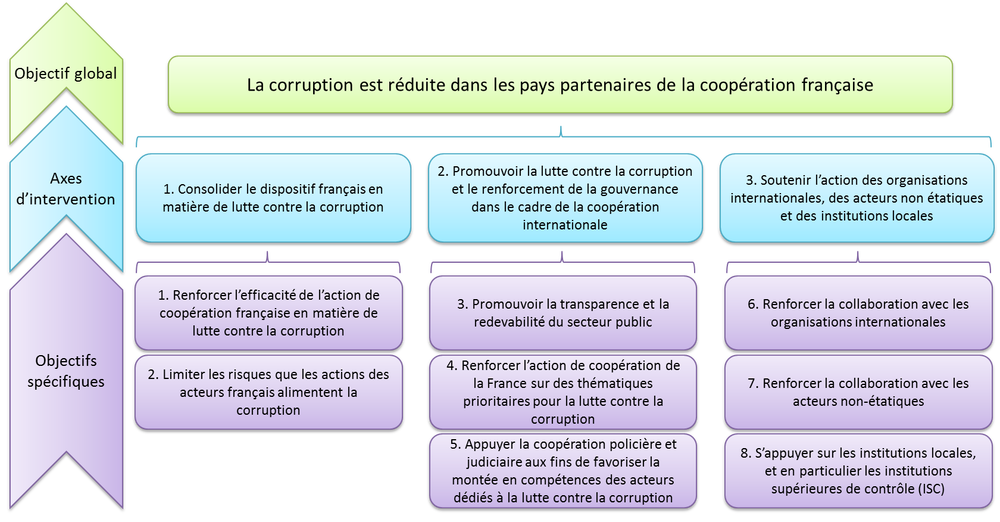La stratégie anticorruption de la France dans son action de coopération Stratégie anticorruption Date de publication : 07 mai 2025 Dernière mise à jour le : 06 février 2026 La corruption est un phénomène global, qui touche tous les espaces, tous les secteurs, tous les acteurs. Difficile à quantifier, le montant annuel des pots de vin et de l’argent détourné s’élèverait à 3 600 milliards de dollars, soit 5 % du produit intérieur brut (PIB) mondial selon les estimations de la Banque mondiale et du Forum économique mondial. La corruption constitue un frein majeur au développement. Détournement des richesses, découragement des investisseurs, confiscation des ressources naturelles, réduction des ressources de l’État, la corruption possède de multiples effets négatifs sur l’activité économique et la légitimité de l’État. Elle fausse la concurrence, favorise l’économie informelle et réduit le consentement à l’impôt. La corruption perturbe l’allocation optimale des fonds et réduit l’efficacité des politiques publiques. En créant des obstacles à une distribution juste et efficace des biens et services, elle altère la capacité de l’État à offrir un service public de qualité, participant ainsi à l’accroissement des inégalités et à la diminution de la confiance des citoyens envers les institutions et les représentants de l’État. Cette confiance est également mise à mal lorsque la corruption atteint les processus électoraux, délégitimant le processus démocratique. De manière générale, la corruption mine l’État de droit et représente un obstacle à la réalisation des droits humains. La corruption favorise le développement de la criminalité, notamment la criminalité organisée, voire du terrorisme et des groupes armés lorsque les fonds détournés viennent alimenter leurs réseaux ou lorsque ces acteurs emploient la corruption pour poursuivre leurs objectifs. Elle est un facteur de crise et de fragilité et possède un impact négatif sur la sécurité et à la stabilité aux niveaux national, régional et international. C’est pourquoi la France fait de la lutte contre la corruption un axe central de son action au niveau international. La stratégie internationale de lutte contre la corruption accompagnera la France dans ses efforts d’atteinte des Objectifs de développement durable, et notamment l’objectif 16 concernant la mise en place d’institutions efficaces, responsables et ouvertes à tous. Rédigée par l’ensemble des institutions françaises concernées, elle permettra de guider les actions de coopération pour les années à venir.Ainsi, la France contribuera à lutter contre la corruption à travers 8 objectifs regroupés en trois axes d’intervention. Transcription Fermer la transcription Objectifs et axes de la stratégie Objectif global La corruption st rédute dans les pays partenaires de la coopération française. Axes d'intervention Consolider le dispositif français en matière de lutte contre la corruption ; Promouvoir la lutte contre la corruption et le renforcement de la gouvernance dans le cadre de la coopération internationale ; Soutenir l'action des organisations internationales, des acteurs non étatiques et des institutions locales. Objectifs spécifiques Renforcer l'efficacité de l'action de coopération française en matière de lutte contre la corruption ; Limiter les risques que les actions des acteurs français alimentent la corruption ; Promouvoir la transparence et le redevabilité du secteur public ; Renforcer l'action de coopération de la France sur des thématiques prioritaires pour la lutte contre la corruption ; Appuyer la coopération policière et judiciaire aux fins de favoriser la montée en compétences des acteurs dédiés à la lutte contre la corruption ; Renforcer la collaboration avec les organisations internationales ; Renforcer la collaboration avec les acteurs non étatiques ; S'appuyer sur les institutions locales et en particulier les institutions supérieures de contrôle (SIC) Cette stratégie se décline en une série d’actions concrètes et selon un calendrier précis (« cadre de redevabilité »). Parmi ces actions, sont prévues : des actions visant à réduire les risques, avec notamment le renforcement de la formation des agents publics ; un accompagnement des institutions, de la police et de la justice ; une collaboration étroite avec la société civile. Document Télécharger la stratégie anticorruption de la France dans son action de coopération PDF - 3 068.3 KB