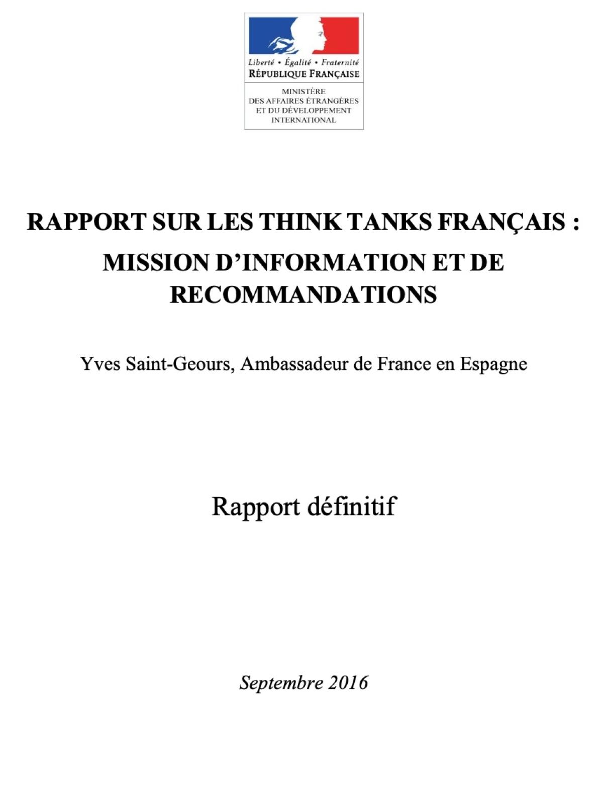 Le rapport Saint-Geours Coopération Date de publication : Septembre 2016 Dernière mise à jour le : 06 février 2026 À la demande de Jean-Marc Ayrault, Yves Saint-Geours, ambassadeur de France en Espagne, a conduit une réflexion sur la situation des think tanks français spécialisés dans le domaine de la politique étrangère et sur les conditions propres à assurer leur développement. Ce rapport, qui a été remis le 27 octobre 2016, a permis de faire un état des lieux et recommande une série de mesures pour valoriser le travail des think tanks et analystes français et faciliter notamment la mobilité des jeunes chercheurs. Certaines de ces recommandations sont d’ores-et-déjà mises en œuvre ou en cours de mise en œuvre. Document Télécharger le rapport sur les think tanks français PDF - 867.0 KB