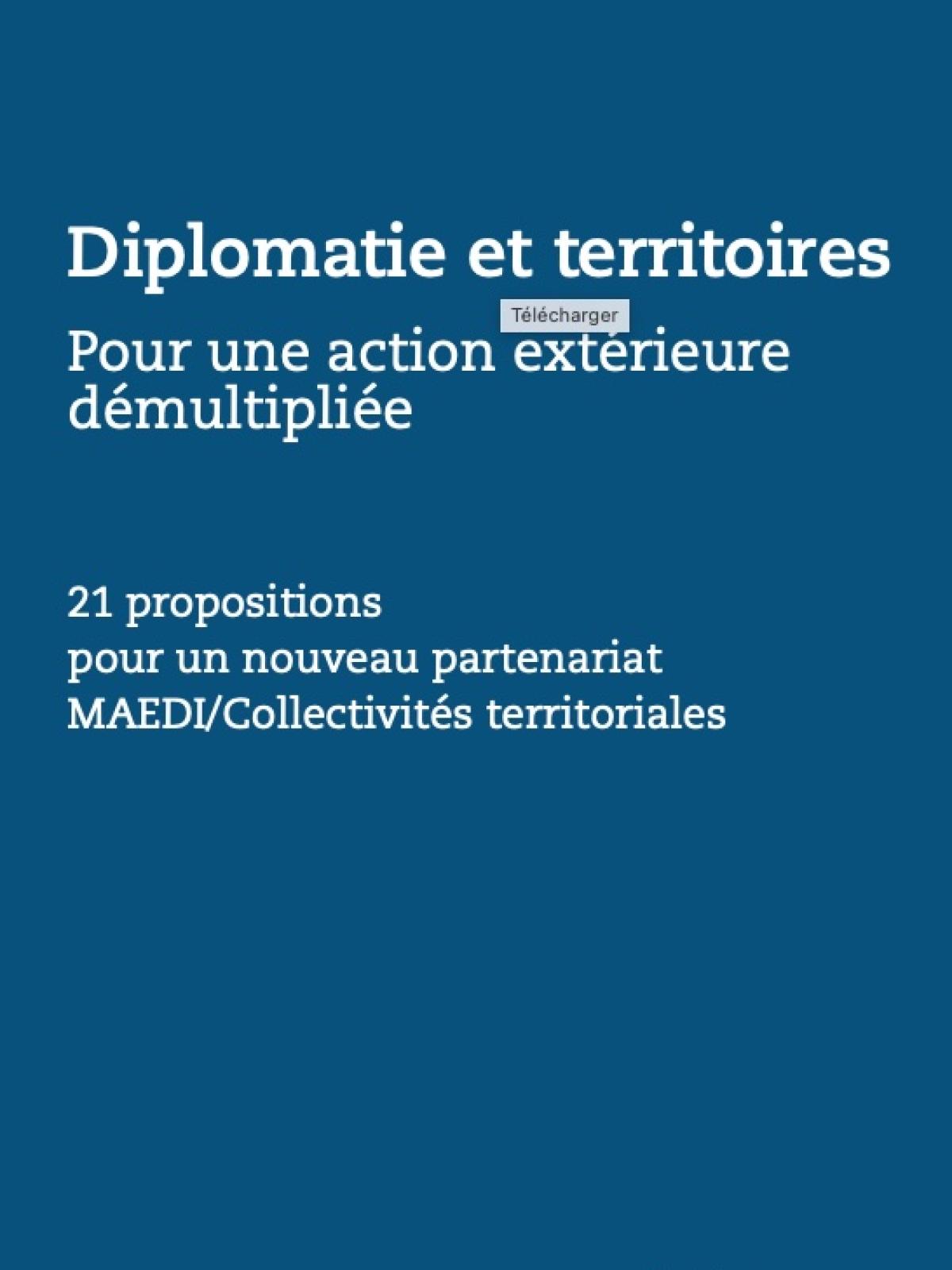 Livre blanc "Diplomatie et territoires" Coopération Date de publication : 07 mai 2017 Dernière mise à jour le : 06 février 2026 Dans la lignée du rapport Laignel (2013), et de la réforme territoriale de 2014-15, le Livre blanc « Diplomatie et territoires », dont le ministre de l’Europe et des Affaires étrangères (MEAE) a demandé la rédaction à ses services, rassemble l’état de l’action extérieure des collectivités territoriales et présente 21 propositions concrètes, visant à améliorer le partenariat entre l’Etat et les collectivités territoriales, au profit d’une plus grande efficacité de notre action extérieure. Il s’agit d’une synthèse inédite, fruit d’une consultation large dans le cadre de la Commission nationale de la coopération décentralisée et auprès des présidents du Sénat et de l’Assemblée Nationale. Ce document revêt également une dimension prospective, s’agissant notamment de l’avenir des relations entre les collectivités territoriales et l’Etat, avec au premier chef, le MEAE, ses opérateurs et les postes diplomatiques. Le 23 novembre 2016, la séance plénière de la Commission Nationale de Coopération Décentralisée (CNCD) a validé le Livre blanc. « Diplomatie et territoires » a été édité par la Documentation française. Il est ainsi disponible en version papier sur leur site internet et peut être consulté et téléchargé ci-dessous. Informations complémentaires Contacter la DCTCIV Coordonnées Recevoir les actualités de la coopération décentralisée Liens utiles Réseaux régionaux multi-acteurs Associations et groupes d’élus Réseaux thématiques Instances européennes et internationales Annuaires (contacts en ambassades et en régions) Documents annexes Télécharger le livre blanc "Diplomatie et territoires" PDF - 1 753.2 KB