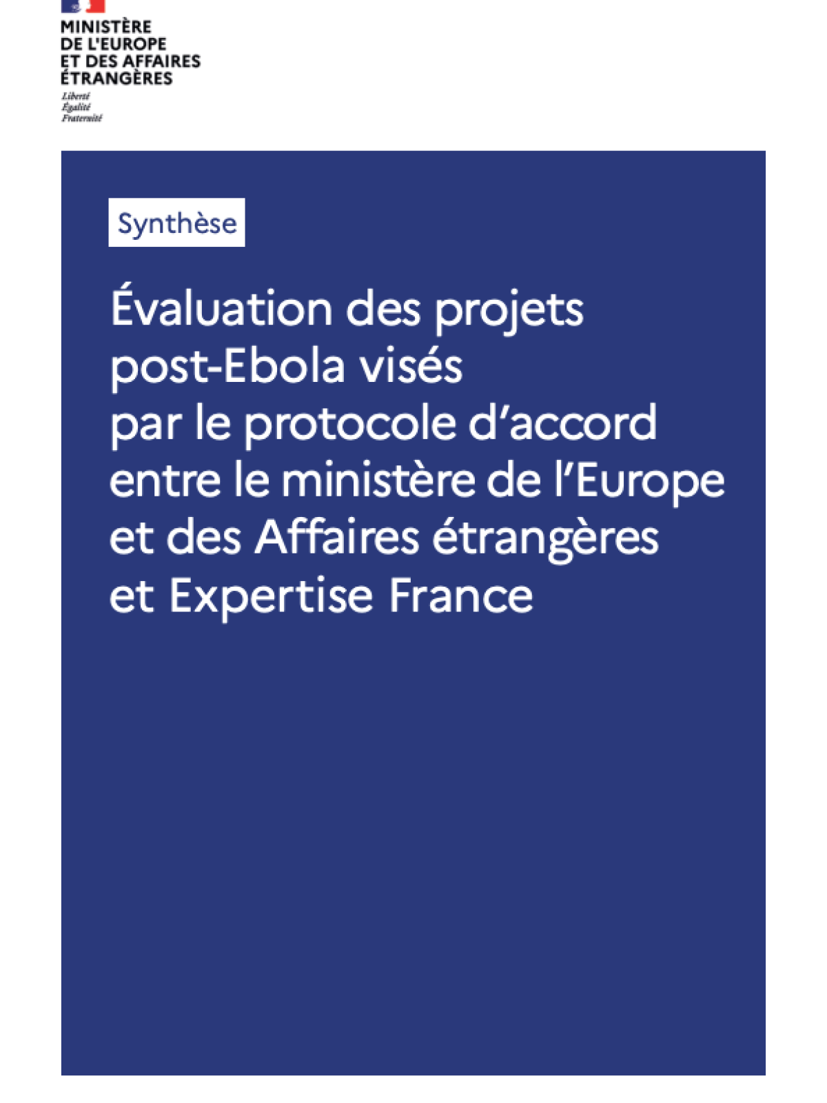 Synthèse - Évaluation des projets post-Ebola visés par le protocole d’accord entre le ministère de l’Europe et des Affaires étrangères et Expertise France (16 mars 2021) Santé mondiale Date de publication : 07 mai 2025 Dernière mise à jour le : 06 février 2026 Cette évaluation finale concerne cinq projets post-Ebola, financés par le ministère de l’Europe et des Affaires étrangères (MEAE) et mis en œuvre par Expertise France (EF) de 2015 à août 2019, principalement en Guinée et, dans une moindre mesure, au Libéria. L’objectif général de l’évaluation est de rendre compte de la mise en œuvre des projets et de leurs résultats, et de tirer des enseignements utiles pour nourrir la réflexion stratégique et opérationnelle des acteurs que sont le MEAE et EF. Les résultats de l’évaluation démontrent : une capacité à répondre aux besoins exprimés par les partenaires nationaux et à relayer les priorités françaises, mais une moindre pertinence des moyens mobilisés du fait de l’absence de relais domestiques ou internationaux ; une cohérence surtout notable avec les interventions d’autres bailleurs, même si une certaine complémentarité a pu être observée entre les projets ; des objectifs globalement atteints, avec toutefois des retards d’exécution qui ont affecté certains résultats sans engendrer de coûts supplémentaires ; des effets structurants sur certains piliers du système de santé en Guinée ainsi que sur l’atteinte des capacités essentielles du règlement sanitaire international. Parmi les enseignements identifiés, les évaluateurs recommandent un renforcement de l’instruction et de la mise en œuvre des projets, impliquant leur appropriation par les autorités locales dès le début de leur élaboration. Le deuxième enseignement concerne la capacité des acteurs à mettre en œuvre les priorités stratégiques françaises en santé mondiale 2017-2020 (Stratégie de la France en santé mondiale, 2017), en adoptant une démarche de conception de projet méthodique qui prenne en compte la revue systématique des différentes dimensions de la santé (holistique) et le caractère durable des interventions à mener. Enfin, les évaluateurs invitent EF à renforcer ses capacités techniques internes en renforcement des systèmes de santé et sécurité sanitaire internationale, tout en développant son ancrage au niveau du pays. Documents Télécharger le rapport final PDF - 2 300.7 KB Télécharger la synthèse PDF - 1 079.7 KB