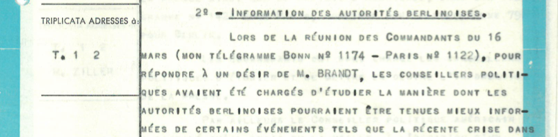 Berlin dans la Guerre froide (1948-1989) Allemagne Archives diplomatiques Date de publication : 19 janvier 2026 Dernière mise à jour le : 10 février 2026 Pendant toute la durée de la Guerre froide, Berlin est un lieu emblématique de l’affrontement Est-Ouest. Dès 1945 le monde occidental conçoit Berlin comme un avant-poste de sa confrontation avec le bloc communiste. Ce dossier pédagogique permet de travailler à partir de documents originaux sur les trois moments clés de l’histoire de Berlin au cœur de la Guerre froide, en lettres, langues et histoire-géographie. Présentation Pour aider à la mise en œuvre de séquences pédagogiques, le dossier propose : un tableau et un organigramme qui récapitulent les propositions par discipline (histoire, lettres et anglais) des fiches de travail en histoire, anglais, lettres (objectifs, références des documents du CADN, mise en œuvre proposée) une sélection de documents issus des Archives diplomatiques Chaque fiche de travail est conçue comme une activité pouvant se faire de manière indépendante des autres. Télécharger le tableau de synthèse PDF - 367.7 KB Télécharger "Lire un télégramme diplomatique" PDF - 1 114.1 KB Points de programme concernés Histoire 3e : thème 2, le monde depuis 1945 / Un monde bipolaire au temps de la guerre froide Terminale : thème 2, la multiplication des acteurs internationaux dans un monde bipolaire (de 1945 au début des années 1970) ; thème 3, les remises en cause économiques, politiques et sociales des années 1970 à 1991 Spécialité Histoire, géopolitique, sciences politiques 1e : thème 2, analyser les dynamiques des puissances internationales ; thème 3, étudier les divisions politiques du monde : les frontières Terminale : thème 6, l’enjeu de la connaissance / les services secrets durant la guerre froide Anglais Utilisation de documents authentiques pour la pratique des activités langagières : compréhension écrite, production écrite et production orale Le thème s’inscrit dans le cadre des notions « Lieux et formes de pouvoir », « Espaces et échanges », « Mythes et héros » Lettres Activités : lire et analyser des images, fixes et mobiles ; comparer des textes, des documents et des supports ; faire des recherches documentaires et en exploiter les résultats ; pratiquer diverses formes d’écriture (fonctionnelle, argumentative, fictionnelle, etc.) ; s’exercer à la prise de parole, à l’écoute, à l’expression de son opinion et au débat argumenté. Exercices : écriture d’argumentation ; écriture d’invention ; écriture de synthèse et de restitution ; exposé oral. Le blocus de Berlin (1948-1949) Télécharger le tableau de synthèse PDF - 289.6 KB Fiches de travail Télécharger la Fiche 1 : histoire PDF - 1 614.8 KB Télécharger la fiche 2 : anglais PDF - 66.8 KB Télécharger la fiche 3 : anglais PDF - 176.6 KB Documents Télécharger Histoire : documents 1 à 7 ZIP - 5 318.7 KB Télécharger Histoire : documents 8 à 10 ZIP - 2 626.3 KB Télécharger Histoire : document 11 ZIP - 4 581.0 KB Télécharger Histoire : document 12 ZIP - 2 910.4 KB Télécharger Histoire : document 13 ZIP - 3 733.8 KB Télécharger Histoire : documents 14 à 16 ZIP - 5 346.3 KB Télécharger Anglais : documents 14 et 15 ZIP - 5 239.4 KB Télécharger Anglais : documents 17 et 18 ZIP - 1 157.4 KB La construction du mur (1961) Cette vidéo de la série « La parole aux archives » est destinée aux élèves et enseignants et basée sur les documents originaux des Archives diplomatiques.Conception et réalisation : Université de Nantes (Laboratoire d’innovation pédagogique sur l’Europe) et Centre des Archives diplomatiques de Nantes. Tableau de synthèse Télécharger le tableau de synthèse PDF - 334.1 KB Fiches de travail Télécharger Fiche 4 : anglais PDF - 68.5 KB Télécharger Fiche 5 : anglais PDF - 153.6 KB Télécharger Fiche 6 : histoire PDF - 47.2 KB Documents Télécharger Histoire : documents 19 à 22 ZIP - 4 642.9 KB Télécharger Histoire : documents 23 à 25 ZIP - 3 035.4 KB Télécharger Histoire : documents 26 à 29 ZIP - 4 669.4 KB Télécharger Anglais : documents 30 à 35 ZIP - 4 322.9 KB Télécharger Lettres : document 23 ZIP - 995.8 KB La chute du mur (1989) Tableau de synthèse Télécharger le tableau de synthèse PDF - 198.6 KB Fiches de travail Télécharger Fiche 7 : lettres PDF - 355.6 KB Télécharger Fiche 8 : histoire PDF - 221.5 KB Documents Télécharger Histoire : documents 36 à 44 bis ZIP - 1 096.9 KB Télécharger Lettres : document 45 ZIP - 108.9 KB Documents d'ensemble Télécharger le tableau de synthèse PDF - 367.7 KB Télécharger l'organigramme dy dossier pédagogique PDF - 48.9 KB Télécharger la liste des documents d'archives PDF - 448.0 KB Télécharger Fiche 9 : évaluation en histoire PDF - 338.2 KB Ce dossier a été élaboré par un groupe de travail associant le Rectorat de l’académie de Nantes (Délégation académique à l’éducation artistique et à l’action culturelle) et le Centre des Archives diplomatiques de Nantes. Soizick Jarno, Nicolas Albert, professeurs d’histoire-géographie, Sabine Manciaux, professeur d’anglais et Karin Catacchio, professeur de lettres ont conçu le dossier pédagogique à partir de documents des ambassades de France à Berlin-Est, Bonn, Londres et Moscou, puis l’ont expérimenté avec leurs élèves de 1ère du lycée Alcide-d’Orbigny de Bouaye (Loire-Atlantique).