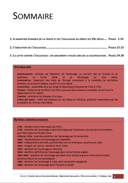 Les abolitions de l’esclavage au 19e siècle Archives diplomatiques Date de publication : 16 janvier 2026 Dernière mise à jour le : 06 février 2026 Les grandes puissances interdisent la traite au début du 19e siècle mais elle perdure et alimente longtemps l’esclavage. Celui-ci, condamné par une partie croissante des opinions publiques, suscite des révoltes et des oppositions croissantes chez les esclaves. Mais il disparaît progressivement entre 1825 et 1888 en fonction des choix des États. Ce dossier pédagogique a été initialement élaboré au Centre des Archives de La Courneuve pour des élèves de Collège participant à un concours. Il peut être adapté à tous les niveaux, être utilisé en classe ou lors d’un atelier aux Archives diplomatiques. Télécharger le dossier : « Les abolitions de l’esclavage au 19e siècle » PDF - 15 597.1 KB