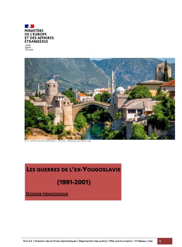 Les guerres de Yougoslavie (1991-2001) Archives diplomatiques Date de publication : 16 janvier 2026 Dernière mise à jour le : 06 février 2026 La Fédération yougoslave connaît des relations tendues entre nationalités dès les années 1980. Elle éclate à la suite de guerres qui sont les premières en Europe depuis 1945. La communauté internationale est longtemps impuissante face aux exactions, aux crimes contre l’humanité. Mais après les accords de paix, la justice internationale progresse aussi. Ce dossier pédagogique a été initialement élaboré au Centre des Archives de La Courneuve pour des élèves de troisième. Il peut être adapté à tous les niveaux, être utilisé en classe ou lors d’un atelier aux Archives diplomatiques. Télécharger le dossier PDF - 3 408.5 KB