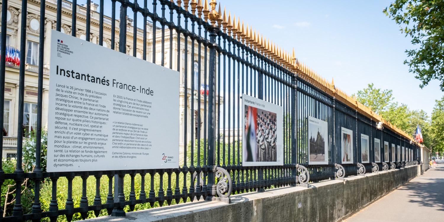 « Instantanés France – Inde » - Exposition photographique (juillet 2023) Inde Relations bilatérales Actualité Publié le : 22 juillet 2023 Mis à jour le : 18 mars 2026 Lancé le 26 janvier 1998 à l’occasion de la visite en Inde du président Jacques Chirac, le partenariat stratégique entre la France et l’Inde incarne la volonté des deux nations de développer ensemble leur autonomie stratégique respective. Ce partenariat repose sur quatre piliers historiques : défense, nucléaire civil, spatial et sécurité. Il s’est progressivement enrichi d’un volet cyber et numérique mais aussi d’un engagement commun pour la planète sur les grands enjeux mondiaux : climat, environnement, santé. La relation se fonde également sur des échanges humains, culturels et économiques toujours plus dynamiques. En 2023, la France et l’Inde célèbrent les vingt-cinq ans de leur partenariat stratégique. Cet anniversaire nous donne l’occasion de revenir sur une relation bilatérale exceptionnelle à travers une exposition photographique installée sur les grilles du Quai d’Orsay (Paris). « La relation franco-indienne est un partenariat stratégique qui ne cesse de se renforcer et qui fait de l’Inde un partenaire majeur de la France en Asie et dans l’Indopacifique. C’est aussi un partenariat résolument tourné vers le futur. C’est enfin un partenariat des cœurs et une amitié inébranlable entre nos deux pays. » Catherine Colonna, ministre de l’Europe et des Affaires étrangères. Informations complémentaires Instantanés diplomatiques Images France/Inde Documents de référence Traités bilatéraux