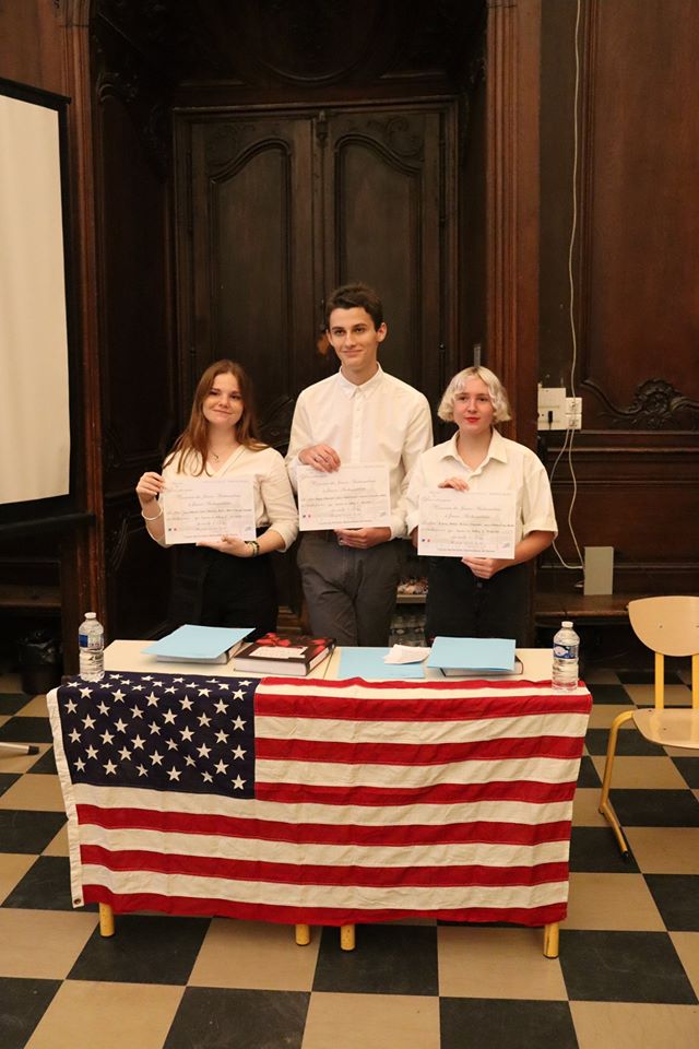 Les lauréats du concours des jeunes ambassadeurs/ambassadrices 2019-2020 Archives diplomatiques Actualité Publié le : 10 juillet 2020 Mis à jour le : 05 janvier 2026 Parmi les collégiens et lycéens des 25 établissements scolaires des Pays de la Loire et d’Ile-de-France qui participaient à la troisième édition du concours, les élèves des collèges Iles de Loire (Saint-Sébastien, 44) et Federico Garcia Lorca (Saint-Denis, 93), des lycées Joachim du Bellay (Angers, 49) et Duplessis Mornay (Saumur, 49) et du lycée professionnel Michelet (Nantes, 44) ont été distingués par le jury. « 29 juin 1919 : vous êtes ambassadeur de l’une des puissances de l’Entente (France, Grande-Bretagne, Italie ou États-Unis) et vous défendez dans votre discours les clauses du Traité de Versailles pour garantir la paix future. » C’est le défi que devaient relever les candidats. Près de 600 élèves et leurs professeurs se sont prêtés à l’exercice. Après un travail préparatoire basé sur les documents originaux du ministère de l’Europe et des affaires étrangères et une visite des Archives diplomatiques, les élèves ont imaginé et mis en scène ce discours. Recherche, qualité de l’argumentation et force de conviction ont été valorisés par le jury du concours. Le prochain concours proposera aux élèves un travail autour de la guerre d’indépendance américaine : « 1783 : pour l’amitié entre la France et les États-Unis. » La Courneuve Collèges 1er prix Myron NICOLAS, collège Federico Garcia Lorca (Saint-Denis). Professeur : Mme Perraud. 2e prix Cynthia CASIMIR, Emy LENGANIA-KOUBET et Coline VIDAL (collège Pierre et Marie Curie, Villiers sur Marne). Professeur : Mme Sagan. 3e prix ex-aequo Zainab ABDUL-WAHAB et Bassma BOUHADDOU, collège Jean Lolive (Pantin). Professeur : M. Verhaegen. Leïna BENYAHIA, Leïma DALMEUS et Ivona GOLUBOVIC, collège Federico Garcia Lorca (Saint-Denis). Professeur : Mme Perraud. Nantes Collèges 1er prix Hélian OZAN, Noalyne HAMEON et Yanna NICOLEAU, collège Îles de Loire (Saint-Sébastien – 44). Professeurs : Mmes Levanen et Ranc-Blouin. Télécharger le discours des lauréats - 1er prix (collège Iles de Loire) PDF - 65.8 KB 2e prix Célia BIDET, Noémie BRULARD-SOULARD, Julie GABORIAU, Basile GODART, Benjamin LE GAC, Elliot O’BRIEN, Mathys PEDROCCHI et Nolwen TUFFERY, LPO Jean Monnier (Les Herbiers – 85). Professeurs : Mmes Poirier et Foissey. 3e prix Jade MERCADIE, Hannah LECOUTRE , Léo Murzeau , Lou-Anne PETITGAS et Lana GILLES, collège Pierre Garcie Ferrande (Saint-Gilles-Croix-de-Vie – 85). Professeur : M. Javerliat. Lycées 1er prix ex-aequo Laura GIRAULT et Alexandre MARTIN, lycée Duplessis Mornay (Saumur – 49). Professeur : M. Liothaud. Télécharger le discours des lauréats - 1er prix (lycée Duplessis Mornay) PDF - 79.7 KB Antoine HERVE, Hadrien MONRIBOT, Jeanne MORVAN et Emma ROULEAU, lycée Joachim du Bellay (Angers – 49). Professeur : Mme Dugué. Télécharger le discours des lauréats - 1er prix (lycée J. du Bellay) PDF - 263.4 KB 2e prix Manon ROUSSEAU, Lucas PAULEAU et Corentin PICHAUD, lycée Blaise Pascal (Segré – 49). Professeur : Mme Baumard. Lycées professionnels 1er prix Classe de Terminale gros-œuvre/travaux publics, LP Michelet (Nantes – 44). Professeur : M. Le Chévéré. Télécharger le discours des lauréats - 1er prix (LP Michelet) PDF - 215.9 KB