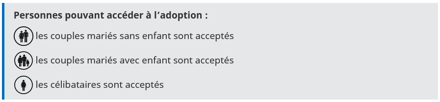Adoption - Autres pays - Arménie AVERTISSEMENT : Interdiction des adoptions individuelles Suite à l’interdiction des adoptions individuelles entrée en vigueur le 23 février 2022, et en l’absence d’opérateur autorisé et habilité pour l’adoption en Arménie, il n’est pas possible d’adopter un enfant dans ce pays. Arménie Adoption internationale Publié le : 17 novembre 2025 Mis à jour le : 02 avril 2026 Consultez la liste des pays ouverts à l’adoption. L’Arménie a ratifié la convention de La Haye du 29 mai 1993 sur la protection des enfants et la coopération en matière d’adoption internationale le 1er mars 2007. Les informations ci-dessous concernent uniquement les adoptions internationales qui ont pu intervenir avant l’interdiction des adoptions individuelles entrée en vigueur le 23 février 2022. Transcription Fermer la transcription Les couples mariés sans enfant sont acceptés Les couples mariés avec enfant sont acceptés Les célibataires sont acceptés Communiqué suite à une mission réalisée en Arménie du 6 au 9 juin 2017 : A la suite de la décision de l’opérateur Médecins du Monde de cesser progressivement ses activités d’adoption internationale dans l’ensemble des pays où il était implanté –dont l’Arménie–, une délégation de la Mission de l’adoption internationale s’est rendue dans ce pays du 6 au 9 juin 2017. A l’issue de réunions de concertation avec l’autorité centrale arménienne et afin d’éviter toute pression sur les autorités de cet État dans le processus actuel de mise en œuvre effective de la Convention de la Haye de 1993 sur la protection des enfants et la coopération en matière d’adoption internationale, il a été décidé, à compter du présent communiqué, de ne plus enregistrer de nouveaux dossiers jusqu’à l’implantation d’un nouvel opérateur français en conformité avec la prochaine réglementation arménienne en la matière. A titre transitoire, seuls pourront se poursuivre jusqu’à leur terme les dossiers déjà enregistrés à la Mission de l’adoption internationale à la date du présent communiqué selon les modalités suivantes : les dossiers enregistrés par Médecins du Monde (MdM) à la date du présent communiqué qui auront donné lieu à un apparentement avant le 31 décembre 2017 se poursuivront par l’intermédiaire de cet opérateur ; les autres dossiers, c’est-à-dire les dossiers individuels enregistrés auprès de l’Autorité centrale arménienne par l’intermédiaire de la MAI avant le 19 mai 2014, date de l’accréditation de l’OAA Médecins du Monde, ainsi que ceux accompagnés par MdM n’ayant pas donné lieu à apparentement au 31 décembre 2017 seront traités directement et exclusivement d’autorité centrale à autorité centrale. Par conséquent et désormais, les procédures individuelles, c’est-à-dire celles qui ne sont ni accompagnées par MdM ni suivies directement par les autorités centrales dans les conditions ci-dessus énoncées, sont interdites en Arménie. Avant propos : Exigences du droit français I - Exigences du droit local 1. Le cadre juridique de l’adoption en Arménie Code de la Famille de la République d’Arménie du 8 décembre 2004, entré en vigueur le 19 avril 2005. 2. Qui peut adopter ? Les couples mariés. Une préférence est accordée aux couples mariés dont l’un au moins des conjoints est d’origine ou de nationalité arménienne. Les célibataires. Différence d’âge avec l’enfant : 18 ans minimum et 50 ans maximum, sauf dans le cadre de l’adoption de l’enfant du conjoint d’origine arménienne. 3. Quels enfants peuvent être proposés à l’adoption internationale ? Critères juridiques d’adoptabilité : Age de l’enfant : de 3 mois à 18 ans Un enfant arménien est adoptable par des étrangers : s’il n’a pas de filiation connue s’il est orphelin s’il est déclaré judiciairement abandonné si ses parents ou représentants légaux ont valablement consenti à l’adoption. si ses parents ont été déchus de l’autorité parentale s’il est inscrit dans la base de données nationale des enfants adoptables depuis plus de trois mois Les enfants âgés de plus de dix ans doivent consentir à leur adoption. 4. Qui peut vous accompagner dans votre démarche ? En application de la convention de La Haye du 29 mai 1993 sur la protection des enfants et la coopération en matière d’adoption internationale, l’adoption individuelle est interdite. Voir communiqué en début de page. Pour toute information complémentaire concernant les opérateurs de l’adoption internationale, vous pouvez consulter la rubrique : « Organismes agréés pour l’Adoption (OAA) » II - Type de décision 1. Forme de la décision La décision prononcée par les autorités locales est une décision judiciaire. 2. Effets de la décision Les effets de la décision en droit arménien sont : rupture des liens de filiation entre l’enfant et sa famille d’origine mais possibilité de maintenir une communication dans certains cas, sur décision du juge ; création d’un lien de filiation entre l’enfant et la famille adoptive ; Révocabilité (pour motifs graves) III - Procédure 1. Constitution du dossier en France A titre indicatif et sous réserve d’éventuelles modifications, le dossier doit comporter les pièces énumérées ci joint en un exemplaire original. Télécharger "Constitution du dossier de candidature à l’adoption en Arménie" PDF - 222.0 KB Tous les documents doivent être apostillés par la Cour d’appel compétente pour le lieu où ils ont été émis, ou pour le lieu où leur copie a été certifiée conforme. 2. Procédure locale Annexe 1 : Étapes de la procédure locale : Télécharger "Étapes de la procédure locale" PDF - 5.1 KB L’accompagnement par un avocat n’est pas obligatoire. Plusieurs séjours dans le pays sont nécessaires, d’un total de un à 3 mois. 3. 