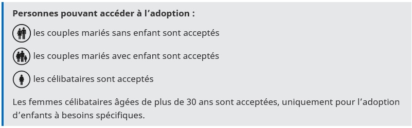 Adoption - Autres pays - Chine AVERTISSEMENT : restriction de l’adoption internationale Le 28 août 2024, la République populaire de Chine a pris la décision souveraine de restreindre l’adoption internationale d’enfants chinois à l’égard de pays tiers, aux seuls enfants du conjoint et des enfants de parents collatéraux jusqu’au troisième degré. Ceci a pour conséquence l’arrêt des autres procédures d’adoption internationale, y compris celles ayant déjà donné lieu à un apparentement. Chine Publié le : 19 novembre 2025 Mis à jour le : 02 avril 2026 AVERTISSEMENT : interdiction des adoptions individuelles La loi n° 2022-219 du 21 février 2022 visant à réformer l’adoption est entrée en vigueur en France. Parmi les changements introduits par ce texte, les adoptions internationales par démarche individuelle sont désormais prohibées. Les informations ci-dessous concernent uniquement les adoptions internationales qui ont pu intervenir avant l’interdiction des adoptions individuelles entrée en vigueur le 23 février 2022. Consultez le communiqué de la MAI. Avant propos : Exigences du droit français La Convention de La Haye du 29 mai 1993 sur la protection des enfants et la coopération en matière d’adoption internationale est entrée en vigueur en Chine le 1er janvier 2006. Hong-Kong et Macao sont soumis à un régime dérogatoire en matière d’adoption et ne sont pas concernés par la présente fiche. Transcription Fermer la transcription Les couples mariés sans enfant sont acceptés Les couples mariés avec enfant sont acceptés Les célibataires sont acceptés Les femmes célibataires âgées de plus de 30 ans sont acceptées, uniquement pour l'adoption d'enfants à besoins spécifiques. NOTE DU CCCWA du 11 mars 2011 : "Ouverture de l’adoption des enfants à besoins spécifiques aux femmes célibataires" Télécharger Notice du CCWA JPG - 41.7 KB 1. Le cadre juridique de l’adoption en République populaire de Chine Règlement du 10 novembre 1993 relatif à l’adoption d’enfants chinois par des étrangers ; Décret du 25 mai 1999, du Ministère des Affaires Civiles, relatif à l’adoption d’enfants chinois par des étrangers ; Note du China Centre for Children’s Welfare and Adoption (CCCWA) sur la normalisation des demandes d’adoption et des attestations présentées par les candidats étrangers à l’adoption en date du 4 décembre 2000 ; Circulaire du CCCWA de l’adoption, du 28 novembre 2002, relative à l’admission des dossiers d’adoption en République populaire de Chine l’année 2003 ; Note du CCCWA du 11 décembre 2006 sur les critères de sélection des dossiers des candidats étrangers à une adoption en Chine. 2 - Qui peut adopter Les couples hétérosexuels sans enfant ; Les couples hétérosexuels avec enfant si l’enfant adopté est un enfant orphelin, handicapé ou abandonné qui vit dans des institutions de protection sociale. Le nombre d’enfants de moins de 18 ans dans la famille ne doit pas atteindre cinq (sans compter l’enfant adopté) et l’enfant le plus jeune doit avoir atteint l’âge de trois ans. L’adoption d’enfants à besoins spécifiques ne sera pas soumise à la restriction concernant le nombre d’enfants de moins de 18 ans. Ils doivent être mariés depuis au moins deux ans (cinq ans s’il s’agit d’un second mariage). A noter que la Chine n’accepte pas les adoptions par des personnes qui ont divorcé plus de deux fois. Ils doivent n’avoir aucune maladie jugée médicalement inappropriée (une liste est périodiquement mise à jour) ; Ils doivent être âgés d’au moins 30 ans et de maximum 50 ans. Ceux de plus de 50 ans peuvent se porter candidats à l’adoption d’enfants de plus de 6 ans et la différence d’âge doit être inférieure à 50 ans ; Ils doivent être diplômés du secondaire ; Une femme célibataire de plus de 30 ans peut adopter un enfant présentant des besoins spécifiques (EBS). La différence d’âge entre l’adopté et l’adoptante devra alors être de 45 ans au maximum. Le nombre d’enfants de moins de 18 ans dans la famille doit être inférieur à 3 et le plus jeune doit être âgé de 6 ans au moins. Elle devra produire une attestation sur l’honneur de non-homosexualité et désigner un tuteur en cas de décès. Les candidats doivent obligatoirement attester d’une formation en vue de l’adoption d’un enfant chinois, effectuée par l’opérateur, de 12 heures. Au moins un des deux membres du couple doit avoir la nationalité d’un des 17 pays avec lesquels la Chine collabore en matière d’adoption internationale. Les casiers judiciaires des candidats ne doivent comporter aucune mention. Ils doivent être en régularité avec la loi et disposer de tous leurs droits civiques. Les candidats ne doivent pas avoir obtenu leur agrément par recours gracieux ou recours devant le Tribunal administratif. Les enquêtes psychologiques ou sociales effectuées lors des démarches d’agrément doivent avoir conclu à un avis favorable. L’un des candidats doit disposer de revenus stables. Ils doivent disposer d’un seuil minimum de ressources équivalent à 30.000 US dollars annuels (10.000 US dollars pour chacun des adoptants + 10.000 US dollars annuels pour l’enfant), de 40.000 US dollars annuels pour un couple ayant déjà un enfant, 50.000 US dollars annuels pour un couple ayant deux enfants et ainsi de suite… Les ressources s’entendent hors prestations sociales. Pour les candidats dont le revenu annuel familial par tête et le patrimoine familial ne répondent pas à ces exigences mais sont supérieurs aux niveaux de vie moyens locaux, la limite peut être assouplie en conséquence s’ils peuvent fournir un certificat valable. Le revenu annuel de la famille n’inclut pas les fonds de secours, pensions, prestations d’invalidité, subventions aux familles d’accueil, etc. Lorsque l’on calcule le revenu annuel de la famille pa