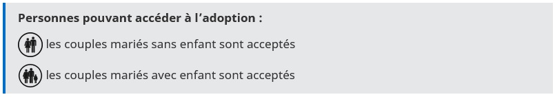 Adoption - Autres pays - Corée du Sud AVERTISSEMENT : Interdiction des adoptions individuelles La loi n° 2022-219 du 21 février 2022 visant à réformer l’adoption est entrée en vigueur en France. Parmi les changements introduits par ce texte, les adoptions internationales par démarche individuelle sont désormais prohibées. Corée du Sud Adoption internationale Publié le : 19 novembre 2025 Mis à jour le : 02 avril 2026 Consultez le communiqué de la MAI. La Corée du Sud n’a pas ratifié la Convention de La Haye du 29 mai 1993 sur la protection des enfants et la coopération en matière d’adoption internationale. Les informations ci-dessous concernent uniquement les adoptions internationales qui ont pu intervenir avant l’interdiction des adoptions individuelles entrée en vigueur le 23 février 2022. I - Exigences du droit local Transcription Fermer la transcription Les couples mariés sans enfant sont acceptés Les couples mariés avec enfant sont acceptés 1 - Le cadre juridique de l’adoption en Corée du Sud Le « Special adoption act » entré en vigueur le 5 août 2012 ; Loi relative « aux cas particuliers concernant l’adoption » entrée en vigueur le 19 septembre 2017. 2 - Qui peut adopter ? Les couples mariés depuis plus de trois ans, et dont aucun membre n’a divorcé plus d’une fois. Les membres du couple doivent être âgés de plus de 25 ans et de moins de 45 ans. Les candidatures de familles ayant déjà 4 enfants (biologiques ou adoptés) sont acceptées, à condition que le dernier soit âgé de plus d’un an à la date de la candidature. Les candidats doivent :• disposer de moyens financiers suffisants pour élever l’enfant adopté,• être diplômés de l’enseignement supérieur,• pouvoir garantir à l’enfant la liberté de religion et une éducation appropriée,• s’engager à ne pas contraindre un enfant adopté à faire une activité qui soit contraire à sa sécurité ou toute activité qui aille à l’encontre des droits humains, • disposer de la possibilité de l’élever et de l’éduquer comme un membre à part entière de la société,• disposer d’un casier judiciaire vierge en ce qui concerne la maltraitance envers les enfants, les violences familiales, les violences sexuelles, les crimes liés aux stupéfiants et autres infractions,• ne pas présenter de dépendance à une drogue ou à l’alcool. Les candidats doivent être éligibles comme parent adoptif conformément à la loi de leur propre pays. Toute personne susceptible de devenir un parent adoptif doit répondre aux obligations prévues par l’Ordonnance du Ministère de la santé et des affaires sociales coréen, relative à la protection des enfants à adopter (notamment en termes de santé et plus particulièrement de pathologies mentales, les personnes qui en sont atteintes n’étant pas éligibles à l’adoption en Corée : consulter l’OAA qui vous accompagne pour plus de précisions. 3 - Quels enfants peuvent être proposés à l’adoption internationale ? Un enfant qui n’a pas de tuteur et dont la protection est demandée par l’autorité administrative locale coréenne habilitée*, aux établissements d’aide prévues par la loi relative à la sécurité des moyens de subsistance (ci-après dénommés « établissements d’aide »), parce qu’il est impossible de trouver une personne en charge de subvenir à ses besoins. Un enfant dont les parents (ou un autre ascendant si les parents ne peuvent pas donner leur consentement pour cause de décès ou autres motifs) ou les tuteurs consentent à l’adoption, et dont la protection est demandée aux établissements d’aide ou aux agences d’adoption coréenne habilitées. L’enfant d’une personne qui est privée de l’autorité parentale par décision de justice et dont la protection est demandée aux établissements d’aide par l’autorité administrative locale coréenne habilitée*. Un enfant dont la protection est demandée aux établissements d’aide par l’autorité administrative locale coréenne habilitée*, car il est impossible de connaitre qui sont les personnes en charge de subvenir à ses besoins. * L’autorité administrative locale coréenne habilitée : le maire d’une ville métropolitaine spéciale, le maire d’une ville métropolitaine, le gouverneur de Do, le gouverneur d’une province autonome spéciale ou le chef d’un Si / Gun / Gu (Gu autonome uniquement). Le consentement des parents biologiques est nécessaire, sauf pour les cas suivants : Lorsque ses parents biologiques sont déchus de leur autorité parentale par décision de justice. Lorsque le consentement de ses parents biologiques ne peut pas être obtenu parce qu’ils sont introuvables. Lorsque les parents biologiques ne peuvent pas donner leur consentement à l’adoption pour l’une des raisons mentionnées ci-dessus, le consentement du tuteur est nécessaire. Le consentement ne peut être donné moins d’une semaine après la naissance de l’enfant. Le consentement doit être écrit et obéir à un formalisme prévu par Ordonnance du Ministère de la santé et des affaires sociales coréen. Il est formellement interdit de donner, de recevoir ou de promettre de l’argent, un bien immobilier ou tout autre avantage en échange du consentement à l’adoption. Si l’adoption d’un enfant âgé de 13 ans ou plus est envisagée, le consentement de l’enfant est également nécessaire, en plus de celle de la personne habilitée à donner son consentement. Avant d’obtenir le consentement à l’adoption, l’agence d’adoption doit fournir aux parents biologiques des conseils suffisants sur les types de soutiens disponibles s’ils élèvent directement un enfant ainsi que les conséquences légales de l’adoption et le contenu des conseils prévus par l’Ordonnance du Ministère de la Santé et des Affaires Sociales coréen. Avant d’obtenir le consentement à l’adoption l’age