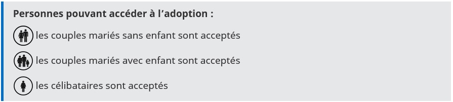 Adoption - Autres pays - Paraguay AVERTISSEMENT : Interdiction des adoptions individuelles Suite à l’interdiction des adoptions individuelles entrée en vigueur le 23 février 2022, et en l’absence d’opérateur autorisé et habilité pour l’adoption au Paraguay, il n’est pas possible d’adopter un enfant dans ce pays. Paraguay Adoption internationale Publié le : 27 novembre 2025 Mis à jour le : 03 avril 2026 Consultez la liste des pays ouverts à l’adoption La Convention de La Haye du 29 mai 1993 sur la protection des enfants et la coopération en matière d’adoption internationale est entrée en vigueur au Paraguay le 1er septembre 1998. Les informations ci-dessous concernent uniquement les adoptions internationales qui ont pu intervenir avant l’interdiction des adoptions individuelles entrée en vigueur le 23 février 2022. Transcription Fermer la transcription Les couples mariés sans enfant sont acceptés Les couples mariés avec enfant sont acceptés Les célibataires sont acceptés Depuis 1998, la France et le Paraguay sont liés par la Convention de La Haye du 29 mai 1993 sur la protection des enfants et la coopération en matière d’adoption internationale. L’adoption internationale n’est accordée qu’exceptionnellement. La préférence est donnée à des nationaux ou à des étrangers résidant définitivement dans le pays plutôt qu’à des étrangers ou des nationaux domiciliés à l’étranger. Le Centre des adoptions, autorité centrale paraguayenne, a fait savoir que, depuis l’entrée en vigueur dans le pays de la Convention de la Haye en 1998, le respect du principe de subsidiarité (priorité accordée à l’adoption nationale) n’a pas permis de proposer d’enfants à l’adoption internationale. Aussi, l’Autorité centrale paraguayenne souhaite, en l’absence d’enfants proposables, qu’aucun dossier de demande d’adoption ne lui soit, pour l’instant, transmis.