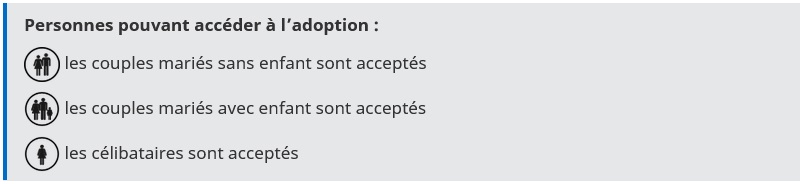 Adoption - Autres pays - République de Macédoine du Nord AVERTISSEMENT : Interdiction des adoptions individuelles Suite à l’interdiction des adoptions individuelles entrée en vigueur le 23 février 2022, et en l’absence d’opérateur autorisé et habilité pour l’adoption en République de Macédoine du Nord, il n’est pas possible d’adopter un enfant dans ce pays. Macédoine du Nord Adoption internationale Publié le : 21 novembre 2025 Mis à jour le : 03 avril 2026 Consultez la liste des pays ouverts à l’adoption La République de Macédoine du Nord a ratifié la Convention de La Haye du 29 mai 1993 sur la protection des enfants et la coopération en matière d’adoption internationale le 23 décembre 2008. Elle y est entrée en vigueur le 1er avril 2009. Les informations ci-dessous concernent uniquement les adoptions internationales qui ont pu intervenir avant l’interdiction des adoptions individuelles entrée en vigueur le 23 février 2022. Bien que n’étant pas prohibée par la loi macédonienne, l’adoption internationale reste très exceptionnelle dans ce pays, qui privilégie des solutions nationales de prise en charge des enfants privés de famille. Les candidats étrangers à l’adoption d’un enfant macédonien doivent obtenir une autorisation spéciale de la Commission des adoptions du Ministère du Travail et des affaires sociales pour pouvoir poursuivre leur procédure. Aucun organisme français autorisé et habilité pour l’adoption n’est accrédité en République de Macédoine du Nord. Nombre d’enfants adoptés : Depuis 1998, 19 adoptions ont été réalisées dans ce pays par des familles françaises ou résidant en France, et aucune depuis l’entrée en vigueur de la Convention de la Haye en 2009. I – Exigences du droit local Transcription Fermer la transcription Les couples mariés sans enfant sont acceptés Les couples mariés avec enfant sont acceptés Les célibataires sont acceptés 1. Le cadre juridique de l’adoption en Macédoine du Nord Convention de La Haye du 29 mai 1993 sur la protection des enfants et la coopération en matière d’adoption internationale ; Loi sur la famille du 12 novembre 2004 publiée au Bulletin officiel de l’ancienne République yougoslave de Macédoine, n°83/04 du 24 novembre 2004. 2. Qui peut adopter ? Les célibataires âgés de moins de 45 ans Les couples mariés dont l’un au moins des conjoints a moins de 45 ans. Par exception, une personne âgée de plus de 45 ans peut adopter un enfant si la différence d’âge avec l’enfant n’est pas supérieure à 45 ans ou en cas d’adoption du frère ou de la sœur d’un enfant déjà adopté. Les adoptants doivent avoir au moins 18 ans de plus que l’adopté, sauf dans le cas de l’adoption de l’enfant du conjoint. L’adoptant doit être apte au travail et présenter les qualités personnelles requises pour l’exercice de l’autorité parentale. Les non-Macédoniens peuvent adopter seulement à condition d’obtenir une autorisation de la Commission des adoptions du Ministère du Travail et des Affaires sociales, délivrée uniquement si l’enfant ne peut être adopté en ARYM. 3. Quels enfants peuvent être proposés à l’adoption internationale ? Age de l’enfant : de 3 mois à 18 ans L’enfant de plus de 12 ans doit donner son consentement, sauf s’il a vécu dans la famille de l’adoptant antérieurement à son adoption. 4. Qui peut vous accompagner dans votre démarche ? En application de la convention de La Haye du 29 mai 1993 sur la protection des enfants et la coopération en matière d’adoption internationale, l’adoption individuelle est interdite. Toutefois, il n’existe pas encore d’organisme français agréé pour l’adoption en Macédoine du Nord. Les candidats doivent donc transmettre leur candidature en Macédoine du Nord par l’intermédiaire de la MAI. II – Type de décision 1. Forme de la décision La décision prononcée par les autorités locales est une décision administrative. 2. Effets de la décision Adoption plénière : Création d’un lien de filiation entre les parents adoptifs et l’enfant ; Rupture des liens de filiation entre l’enfant et sa famille d’origine ; L’adoption est irrévocable. Adoption simple : Création d’un lien de filiation entre l’enfant et la famille adoptive (l’adoption confère à l’enfant le nom de l’adoptant, qui s’ajoute à celui de l’adopté) ; Maintien des liens de filiation entre l’enfant et sa famille d’origine (l’adopté conserve tous ses droits dans sa famille d’origine, notamment ses droits héréditaires) ; L’adoption est révocable s’il y a accord entre l’adoptant et l’adopté. Si l’adopté est mineur, le centre d’aide sociale doit vérifier que l’annulation de l’adoption répond à son intérêt ; L’enfant conserve sa nationalité d’origine. III – Procédure 1. Constitution du dossier en France A titre indicatif et sous réserve d’éventuelles modifications, le dossier doit comporter les pièces énumérées ci joint en un exemplaire original. Les pièces à fournir pour la constitution du dossier en France : Télécharger "Constitution du dossier en France" PDF - 5.5 KB Ces documents (originaux ou copies certifiées conformes) doivent être traduits par un traducteur assermenté en langue macédonienne. L’ensemble des documents est valable pendant un an. La Convention bilatérale franco-yougoslave du 29 octobre 1969,qui dispense les deux États contractants de toute formalité de légalisation, a été maintenue en vigueur (échange de lettres franco-macédoniennes du 14 décembre 1995) : par conséquent, il n’y a pas obligation d’appliquer l’apostille sur un document émis par une autorité française. 2. Procédure locale Les étapes de la procédure locale : Télécharger "Étapes de la procédure locale" PDF - 5.7 KB 3. Obtention du visa de l’enfant adopté Obtention du visa de l’enfan