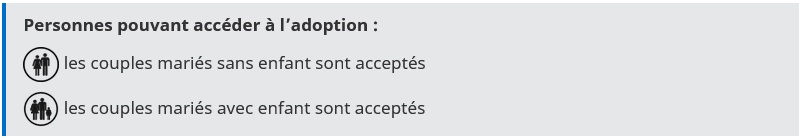 Adoption - Autres pays - Tunisie AVERTISSEMENT : Interdiction des adoptions individuelles Suite à l’interdiction des adoptions individuelles entrée en vigueur le 23 février 2022, et en l’absence d’opérateur autorisé et habilité pour l’adoption en Tunisie, il n’est pas possible d’adopter un enfant dans ce pays. Tunisie Adoption internationale Publié le : 28 novembre 2025 Mis à jour le : 03 avril 2026 Consultez la liste des pays ouverts à l’adoption La Tunisie n’a pas ratifié la Convention de La Haye du 29 mai 1993 sur la protection des enfants et la coopération en matière d’adoption internationale. Avant propos : Exigences du droit français Les informations ci-dessous concernent uniquement les adoptions internationales qui ont pu intervenir avant l’interdiction des adoptions individuelles entrée en vigueur le 23 février 2022. I - Exigences du droit local Transcription Fermer la transcription Les couples mariés sans enfant sont acceptés Les couples mariés avec enfant sont acceptés 1. Le cadre juridique de l’adoption Code de la Protection de l’Enfant du 9 novembre 1995 Loi n° 1958-27 du 4 mars 1958 relative à la tutelle publique, à la tutelle officieuse et à l’adoption modifiée par la loi n° 1959-69 du 19 juin 1959 Code du Statut personnel promulgué par décret du 13 août 1956 Code de la Nationalité tunisienne Loi n° 1998-75 du 28 octobre 1998, relative à l’attribution d’un nom patronymique aux enfants abandonnés ou de filiation inconnue telle que modifiée par la loi n° 2003-51 du 7 juillet 2003 Loi n° 1971-59 du 31 décembre 1971 et décret n° 1973-8 modifié du 8 janvier 1973 relatifs à l’INPE (Institut national de protection de l’enfance) 2. Qui peut adopter ? L’adoptant doit être une personne majeure, mariée, jouissant de la pleine capacité civile, avec un casier judiciaire vierge, en bonne santé et ayant les capacités de subvenir aux besoins de l’enfant Les adoptants doivent avoir au minimum 15 ans de différence avec l’enfant, sauf dans le cas de l’adoption de l’enfant du conjoint L’Institut National de Protection de l’Enfance (INPE), autorité compétente en matière d’adoption internationale en Tunisie, précise également que : L’un ou l’autre conjoint doit être de nationalité tunisienne L’époux doit nécessairement être de confession musulmane. En cas de conversion à l’Islam, une attestation délivrée par l’autorité religieuse tunisienne doit être présentée Les femmes célibataires, divorcées ou veuves peuvent adopter un enfant tunisien sur autorisation expresse du juge tunisien Les hommes célibataires et les couples de même sexe ne peuvent pas adopter en Tunisie L’adoptante doit être âgée de 45 ans maximum, l’adoptant de 50 ans maximum 3. Quels enfants peuvent être proposés à l’adoption internationale ? L’INPE précise que seuls, parmi les enfants mineurs qui lui sont confiés, peuvent être adoptés les enfants sans filiation, orphelins ou déclarés définitivement abandonnés par décision judiciaire placés sous sa tutelle publique. Le directeur de l’INPE exerce la tutelle et doit, à ce titre, rechercher une solution d’intégration définitive et permanente et, si l’adoption est envisagée, donner son consentement à l’adoption de l’enfant. En pratique, il s’agit dans l’immense majorité des cas d’enfants très jeunes, nés hors mariage et abandonnés par leur mère. Mise en garde :Toute procédure d’adoption qui ne concernerait pas un enfant pupille de l’État tunisien et ne respecterait pas la procédure décrite ci-dessous pourrait se heurter à un refus de visa nécessaire à l’entrée et au séjour de l’enfant en France. La Mission de l’adoption internationale met en garde contre toute adoption d’un enfant qui serait menée directement avec les parents de naissance ou une personne assurant la mise en relation, sans intervention de l’INPE. En effet, garante de la bonne application de l’éthique de la convention de La Haye du 29 mai 1993 sur la protection des enfants et la coopération en matière d’adoption internationale, la Mission de l’adoption internationale ne saurait valider des procédures contraires aux principes éthiques de cette même convention.Celle-ci interdit notamment les contacts entre les futurs parents adoptifs et la famille de l’enfant avant que celui-ci ait été déclaré adoptable par les autorités compétentes, l’apparentement direct ou par l’intermédiaire de personnes non autorisées. Elle impose également le respect du principe de subsidiarité, qui suppose que les possibilités de placement de l’enfant dans son État d’origine aient été examinées et qu’il ne soit proposé à l’adoption internationale que si son intérêt l’exige. 4. Qui peut vous accompagner dans votre démarche ? Le recours à un organisme autorisé pour l’adoption n’est pas obligatoire en Tunisie et aucun organisme français n’est habilité dans ce pays. Toutefois, toute procédure d’adoption d’un enfant tunisien doit se dérouler par l’intermédiaire de l’Institut National de Protection de l’Enfance (INPE) rattaché au Ministère des Affaires Sociales, qui se charge de l’examen des dossiers des candidats à l’adoption et de l’apparentement. II - Procédure d’adoption 1. Constitution du dossier en France Les candidats à l’adoption ayant leur résidence habituelle en France doivent obtenir un agrément en vue d’adoption, délivré par le président du conseil départemental de leur domicile. Ils font parvenir à l’INPE, par l’intermédiaire de l’Ambassade de Tunisie en France, un dossier de candidature comprenant les documents suivants (cette liste est donnée à titre indicatif et peut faire l’objet de modification de la part de l’INPE) :• l’agrément des services de l’Aide sociale à l’enfance (ASE),• l’enquête sociale et le rapport psycholo