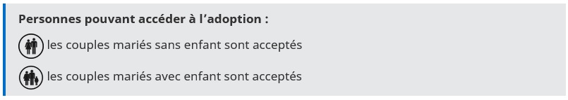 Adopter en Thaïlande AVERTISSEMENT : Interdiction des adoptions individuelles Conformément à la règlementation en vigueur, les adoptions en Thaïlande doivent être accompagnées par un organisme dûment agréé dans les deux États ou par l’Agence Française de l’Adoption. Thaïlande Adoption internationale Publié le : 14 novembre 2025 Mis à jour le : 02 avril 2026 La Convention de La Haye du 29 mai 1993 sur la protection des enfants et la coopération en matière d’adoption internationale est entrée en vigueur en Thaïlande le 1er août 2004. Avant propos : Exigences du droit français Transcription Fermer la transcription Les couples mariés sans enfant sont acceptés Les couples mariés avec enfant sont acceptés 1 - Le cadre juridique de l’adoption en Thaïlande Convention de La Haye du 29 mai 1993 sur la protection des enfants et la coopération en matière d’adoption internationale, Code civil et commercial (articles 1598/19 à 1598/37), Loi sur l’adoption des enfants du 22 avril 1979 modifiée, Code de la Protection des Enfants de 2003, Circulaire n°9 du 22 octobre 2000 en application de la loi sur l’adoption de 1979, Directives 2003 sur l’adoption internationale des enfants thaïlandais. 2 - Qui peut adopter ? Les candidatures des couples mariés sont acceptées. La loi thaïlandaise n’impose aucune durée minimum de mariage. Toutefois, dans la pratique, l’autorité centrale thaïlandaise, le Department of Children and Youth (DCY), n’accepte que les couples mariés depuis au moins 2 ans. Les textes thaïlandais ne comportent aucune disposition relative à l’existence d’enfants dans le foyer des candidats à l’adoption. Toutefois, dans la pratique, les candidatures des couples ayant déjà 2 enfants ou plus (adoptés ou non) ont de faibles chances d’être retenues par le DCY, sauf dans l’hypothèse des projets d’adoption concernant des enfants à besoins spécifiques. Les candidats doivent être âgés de 25 ans au minimum. La différence d’âge entre l’enfant et les parents adoptifs doit être d’au moins 15 ans. Dans la pratique, le DCY impose une écart maximum de 48 ans entre l’enfant et les adoptants. La législation thaïlandaise exige un agrément même dans le cas de l’adoption d’un enfant du conjoint 3 - Quels enfants peuvent être proposés à l’adoption internationale ? Les enfants sont adoptables s’ils sont sans filiation connue, orphelins, déclarés judiciairement abandonnés ou si leurs parents ou représentants légaux ont valablement consenti à l’adoption. L’adoption de plus d’un enfant n’est possible que s’ils sont jumeaux ou en fratrie, si l’adoptant est un parent des enfants, ou s’il s’agit des enfants du conjoint. Compte-tenu du faible nombre d’enfants proposés à l’adoption, les autorités thaïlandaises définissent chaque année un quota d’enfants par opérateur, sauf pour les enfants à besoins spécifiques (EBS). Par EBS, l’AC thaïlandaise entend les enfants âgés de plus de 4 ans, les fratries dont l’un des enfants a plus de 4 ans, et ceux porteurs de handicaps physiques et/ou mentaux. Si l’adopté est âgé de plus de 15 ans, il doit donner son consentement à l’adoption. Attention la législation thaïlandaise exige un agrément même dans le cas de l’adoption d’un enfant du conjoint. 4 - Qui peut vous accompagner dans votre démarche ? En application de la Convention de La Haye, les dossiers des candidats à l’adoption doivent obligatoirement être transmis à l’Autorité centrale thaïlandaise par un organisme autorisé et accrédité en Thaïlande, y compris en cas d’adoption intrafamiliale : en France, l’Agence Française de l’Adoption (AFA) ou un Organisme Autorisé et habilité pour l’Adoption français (OAA). L’adoption privée est en conséquence strictement interdite en Thaïlande et aucune demande ne peut être déposée directement auprès d’une institution locale (crèche, orphelinat, autorité centrale…). Toute adoption qui ne respecterait pas la procédure prévue par cette convention se heurterait à un refus de visa et risquerait de ne pas être reconnue en France. Avant de faire acte de candidature, il est indispensable de vérifier auprès des services de l’Aide sociale à l’enfance de votre département que l’OAA choisi a compétence pour intervenir dans ce département. Pour toute information complémentaire concernant les opérateurs de l’adoption internationale, et les frais afférents à l’adoption vous pouvez consulter la rubrique « Organismes agréés pour l’Adoption (OAA) » et le site de l’AFA. II - Procédure d’adoption 1- Constitution du dossier en France Les candidats à l’adoption ayant leur résidence habituelle en France doivent obtenir un agrément en vue d’adoption, délivré par le président du conseil départemental de leur domicile, puis se tourner vers l’AFA ou un OAA. Si le dossier est accepté par l’opérateur, celui-ci établira un « rapport relatif aux requérants » qui sera transmis avec les pièces requises aux autorités thaïlandaises. Il est important de noter que les autorités thaïlandaises exigent un dossier très détaillé sur la famille comportant son histoire familiale, un rapport social, un rapport psychologique et médical, les activités professionnelles et extra professionnelles de la famille. En outre, les candidats à l’adoption doivent avoir reçu une formation d’au moins 7 heures au jour du dépôt du dossier. Ces formations sont dispensées par l’AFA ou l’OAA. Après instruction et validation par le DCY, le dossier d’adoption sera placé sur une liste d’attente commune à l’ensemble des pays ouverts à l’adoption internationale en Thaïlande. Lors de la Commission d’adoption (Child Adoption Board), une proposition d’apparentement peut être formulée à l’une des familles inscrites sur la liste d’attente. Le DCY adressera à 