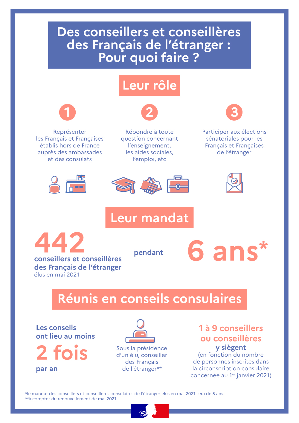 Citoyenneté et élections Publié le : 16 décembre 2022 Mis à jour le : 13 mars 2026 Citoyenneté et élections Menu latéral Services - Contextuel - Megamenu Dans cette rubrique Vie administrative et élections Modalités de vote Vote à l’urne Vote par correspondance Vote par internet Vote par procuration État civil et nationalité française Actualiser son livret de famille Demander la nationalité française Demander la rectification d’un acte d’état civil Demander un acte d'état civil Demander un certificat de nationalité française Déclarer la naissance ou la reconnaissance d’un enfant à l’étranger Déclarer un décès à l’étranger Déclarer une dispersion de cendres en pleine nature En savoir plus sur la double nationalité Enregistrer un pacte civil de solidarité (Pacs) à l’étranger Faire reconnaitre un divorce prononcé à l’étranger L’acquisition de la nationalité française L’attribution de la nationalité française Missions des ambassades et des consulats français en matière d’état civil Missions du Service central d’état civil Obtenir un certificat de non-Pacs Obtenir un certificat de non-inscription au répertoire civil et/ou au répertoire civil annexe Obtenir un certificat d’inscription au répertoire civil et/ou au répertoire civil annexe Obtenir une attestation de Pacs Perdre la nationalité française Procédure de changement de prénom Se marier à l’étranger Être réintégré dans la nationalité française Associations des Français de l’étranger Citoyenneté et élections Résultats de l'élection législative partielle de 2025 Election législative partielle 2025 - Résultats du 1er tour dans la 5ème circonscription Election législative partielle 2025 - Résultats du 2nd tour dans la 5ème circonscription Les différentes élections Liste électorale consulaire Obtenir la communication d’une liste électorale consulaire Rôle des conseillers et conseillères des Français de l’étranger Élection des sénateurs représentant les Français établis hors de France Élections des conseillers des Français de l’étranger et des délégués consulaires 2026 Mémento à l’attention des candidats Consulter les circulaires des candidats Fiscalité Retraite Les différentes élections Élection du Président de la République Le Président de la République est élu, au suffrage universel direct, par les électeurs français lors de l’élection présidentielle. Son mandat dure 5 ans et est renouvelable une fois. Pour être élu, le candidat doit avoir obtenu la majorité absolue des suffrages exprimés. Les 2 candidats arrivés en tête peuvent se présenter au second tour qui intervient 2 semaines après. Pour ce scrutin, il est possible de voter à l’urne et par procuration.Le vote électronique n’est pas prévu par la loi pour l’élection présidentielle. Retrouvez les résultats de l’élection présidentielle de 2017, sur le site du Ministère de l’Intérieur et notre carte interactive des résultats du vote des Français résidant à l’étranger. Élections législatives La représentation à l’Assemblée nationale des Français établis hors de France a été introduite par la révision constitutionnelle du 23 juillet 2008. En 2017, onze députés ont été élus par les Français de l’étranger. Retrouvez sur le site de l’Assemblée nationale la liste des députés élus lors des dernières élections par les Français établis à l’étranger. Sénateurs des Français de l’étranger Les douze sénateurs représentant les Français établis hors de France sont élus au suffrage universel indirect pour six ans comme les autres sénateurs et répartis entre deux séries 1 et 2, de manière à soumettre à l’élection six d’entre eux tous les trois ans. Les sénateurs des Français résidant à l’étranger sont élus au scrutin de liste à la proportionnelle par un collège électoral composé : des députés élus par les Français établis hors de France des sénateurs représentant les Français établis hors de France,- des conseillers des Français de l’étranger,- des délégués consulaires. Retrouvez sur le site du Sénat la liste des sénateurs élus . Conseillers des Français de l’étranger et conseillers à Assemblée des Français de l’étranger (AFE) Depuis la loi n°2013-659 du 22 juillet 2013, les Français à l’étranger sont représentés par des conseillers des Français de l’étranger (442 en 2021) qui élisent ensuite les 90 conseillers à l’Assemblée des Français de l’étranger, et des délégués consulaires (68 en 2021). Les électeurs inscrits sur la liste électorale consulaire peuvent voter à ce scrutin. Les conseillers des Français de l’étranger sont des élus de proximité, représentant les Français établis hors de France auprès des ambassades et des consulats, au sein des conseils consulaires. Les délégués consulaires ont fonction de grands électeurs pour l’élection des sénateurs représentant les Français établis hors de France. Télécharger la transcription textuelle de l’infographie - (PDF, 164 ko) PDF - 164.0 KB Les 442 conseillers des Français de l’étranger élisent parmi eux dans le mois suivant leur élection, les 90 conseillers qui siègent à l’Assemblée des Français de l’étranger (AFE). Consultez l’annuaire des conseillers des Français de l’étranger (Assemblée des Français de l’étranger) Consultez la liste des conseillers à l’assemblée des Français à l’étranger (AFE) Liste des délégués consulaires accessible sur demande à l’adresse suivante : assistanceelections.fae@diplomatie.gouv.fr Pour en savoir plus : Élections des conseillers des Français de l’étranger et délégués consulairesAssemblée des Français de l’étranger Élections Européennes Conformément à la loi n°2018-509 du 25 juin 2018 modifiant la loi n° 77-729 du 7 juillet 1977, l’électio