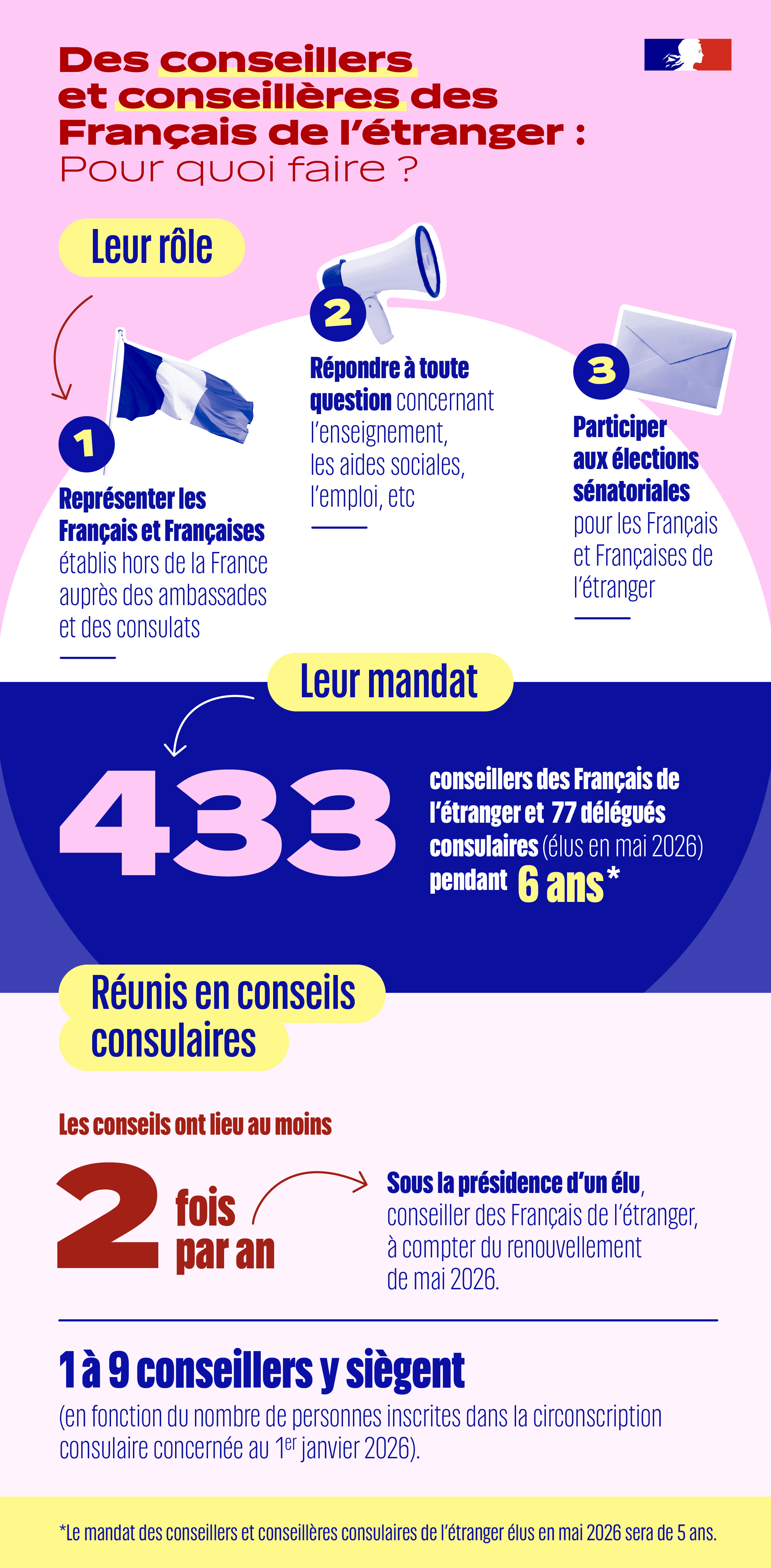 Élections à l'étranger Publié le : 16 décembre 2022 Mis à jour le : 23 avril 2026 Citoyenneté et élections Menu latéral Services - Contextuel - Megamenu Dans cette rubrique Vie administrative et élections État civil et nationalité française Actualiser son livret de famille Demander la nationalité française Demander la rectification d’un acte d’état civil Demander un acte d'état civil Demander un certificat de nationalité française Déclarer la naissance ou la reconnaissance d’un enfant à l’étranger Déclarer un décès à l’étranger Déclarer une dispersion de cendres en pleine nature En savoir plus sur la double nationalité Enregistrer un pacte civil de solidarité (Pacs) à l’étranger Faire reconnaitre un divorce prononcé à l’étranger L’acquisition de la nationalité française L’attribution de la nationalité française Missions des ambassades et des consulats français en matière d’état civil Missions du Service central d’état civil Obtenir un certificat de non-Pacs Obtenir un certificat de non-inscription au répertoire civil et/ou au répertoire civil annexe Obtenir un certificat d’inscription au répertoire civil et/ou au répertoire civil annexe Obtenir une attestation de Pacs Perdre la nationalité française Procédure de changement de prénom Se marier à l’étranger Être réintégré dans la nationalité française Associations des Français de l’étranger Documents officiels à l’étranger Comment faire une demande de carte nationale d’identité ? Comment faire une demande de passeport ? Nouvelle procédure de paiement par timbre électronique Puis-je voyager avec une carte d’identité ou un passeport périmé ? Recensement et journée défense et citoyenneté Renouvellement à distance des passeports Élections à l'étranger Les différentes élections Modalités de vote Vote à l’urne Vote par correspondance Vote par internet Vote par procuration Elections législatives 2024 Liste électorale consulaire Obtenir la communication d’une liste électorale consulaire Rôle des conseillers et conseillères des Français de l’étranger Élections des conseillers des Français de l’étranger et des délégués consulaires 2026 Mémento à l’attention des candidats Consulter les circulaires des candidats Consulter les résultats des élections (vote des Français de l’étranger) Résultats de l'élection législative partielle de 2025 Election législative partielle 2025 - Résultats du 1er tour dans la 5ème circonscription Election législative partielle 2025 - Résultats du 2nd tour dans la 5ème circonscription Résultats des élections législatives anticipées de 2024 Résultats du 1er tour pour les Français de l’étranger Résultats du 2e tour pour les Français de l’étranger Élections européennes 2024 - Résultats Élection des sénateurs représentant les Français établis hors de France 2023 Élection présidentielle 2022 - Résultats pour les Français de l’étranger Élection présidentielle 2022 - Résultats du 1er tour Élection présidentielle 2022 - Résultats du 2nd tour pour les Français de l’étranger Élections des conseillers de l’Assemblée des Français de l’étranger 2021 - Résultats Fiscalité Retraite Les différentes élections Élection du Président de la République Le Président de la République est élu, au suffrage universel direct, par les électeurs français lors de l’élection présidentielle. Son mandat dure 5 ans et est renouvelable une fois. Pour être élu, le candidat doit avoir obtenu la majorité absolue des suffrages exprimés. Les 2 candidats arrivés en tête peuvent se présenter au second tour qui intervient 2 semaines après. Pour ce scrutin, il est possible de voter à l’urne et par procuration.Le vote électronique n’est pas prévu par la loi pour l’élection présidentielle. Retrouvez les résultats de l’élection présidentielle de 2017, sur le site du Ministère de l’Intérieur et notre carte interactive des résultats du vote des Français résidant à l’étranger. Élections législatives La représentation à l’Assemblée nationale des Français établis hors de France a été introduite par la révision constitutionnelle du 23 juillet 2008. En 2017, onze députés ont été élus par les Français de l’étranger. Retrouvez sur le site de l’Assemblée nationale la liste des députés élus lors des dernières élections par les Français établis à l’étranger. Sénateurs des Français de l’étranger Les douze sénateurs représentant les Français établis hors de France sont élus au suffrage universel indirect pour six ans comme les autres sénateurs et répartis entre deux séries 1 et 2, de manière à soumettre à l’élection six d’entre eux tous les trois ans. Les sénateurs des Français résidant à l’étranger sont élus au scrutin de liste à la proportionnelle par un collège électoral composé : des députés élus par les Français établis hors de France des sénateurs représentant les Français établis hors de France,- des conseillers des Français de l’étranger,- des délégués consulaires. Retrouvez sur le site du Sénat la liste des sénateurs élus . Conseillers des Français de l’étranger et conseillers à Assemblée des Français de l’étranger (AFE) Depuis la loi n°2013-659 du 22 juillet 2013, les Français à l’étranger sont représentés par des conseillers des Français de l’étranger (442 en 2021) qui élisent ensuite les 90 conseillers à l’Assemblée des Français de l’étranger, et des délégués consulaires (68 en 2021). Les électeurs inscrits sur la liste électorale consulaire peuvent voter à ce scrutin. Les conseillers des Français de l’étranger sont des élus de proximité, représentant les Français établis hors de France auprès des ambassades et des consulats, au sein des conseils consulaires. Les délégués consulaires ont fonct